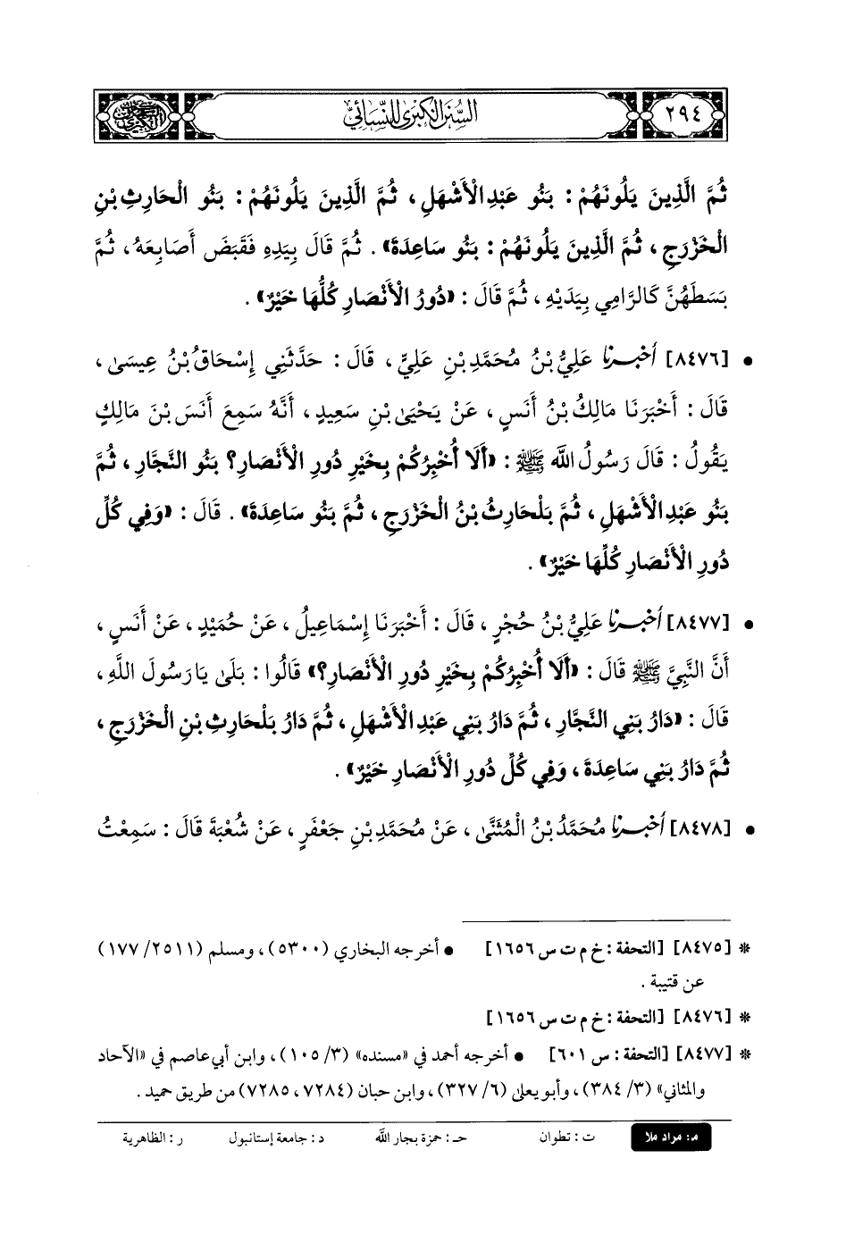 8476 - أَخبَرنا عَليُّ بنُ مُحَمدِ بنِ عَليٍّ، قَالَ: حَدَّثني إِسحَاقُ بنُ عِيسَى، قَالَ: أَخبَرنا مَالِكُ بنُ أَنَسٍ، عَن يَحيَى بنِ سَعِيدٍ، أَنَّهُ سَمِعَ أَنَسَ بْنَ مَالِكٍ يَقُولُ: قَالَ رَسُولُ اللهِ صَلى الله عَلَيهِ وسَلم: أَلا أُخْبِرُكُمْ بِخَيْرِ دُورِ الأَنْصَارِ؟ بَنُو النَّجَّارِ، ثُمَّ بَنُو عَبدِ الأَشْهَلِ، ثُمَّ بَلْحَارِثِ بنِ الخَزْرَجِ، ثُمَّ بَنُو سَاعِدَةَ، قَالَ: وَفِي كُلِّ دُورِ الأَنْصَارِ كُلِّهَا خَيْرٌ.