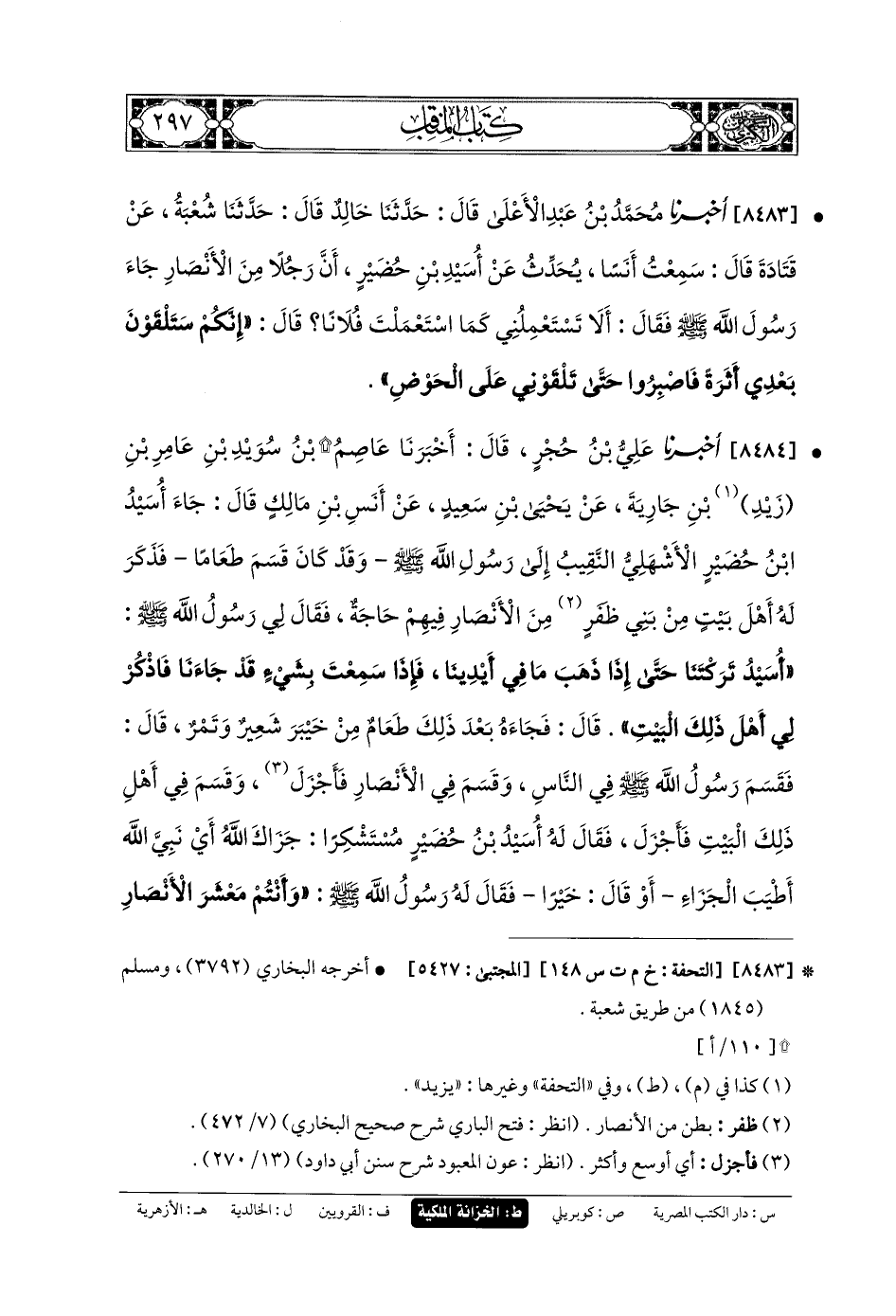 8484 - أَخبَرنا عَليُّ بنُ حُجْرٍ، قَالَ: أَخبَرنا عَاصِمُ بنُ سُوَيْدِ بنِ عَامِرِ بنِ زَيْدِ بنِ جَارِيَةَ، عَن يَحيَى بنِ سَعِيدٍ، عَن أَنَسِ بنِ مَالِكٍ قَالَ: جَاءَ أُسَيْدُ بنُ حُضَيْرٍ الأَشْهَلِيُّ النَّقِيبُ إِلَى رَسُولِ اللهِ صَلى الله عَلَيهِ وسَلم، وَقَدْ كَانَ قَسَمَ طَعَامًا، فَذَكَرَ لَهُ أَهْلَ بَيْتٍ مِنْ بَنِي ظَفَرٍ مِنَ الأَنْصَارِ فِيهِمْ حَاجَةٌ، فَقَالَ لِي رَسُولُ اللهِ صَلى الله عَلَيهِ وسَلم: أُسَيْدُ تَرَكْتَنَا حَتَّى إِذَا ذَهَبَ مَا فِي أَيْدِينَا، فَإِذَا سَمِعْتَ بِشَيْءٍ قَدْ جَاءَنَا، فَاذْكُرْ لِي أَهْلَ ذَلِكَ البَيْتِ، قَالَ: فَجَاءَهُ بَعْدَ ذَلِكَ طَعَامٌ مِنْ خَيْبَرَ شَعِيرٌ وَتَمْرٌ، قَالَ: فَقَسَمَ رَسُولُ اللهِ صَلى الله عَلَيهِ وسَلم فِي النَّاسِ، وَقَسَمَ فِي الأَنْصَارِ فَأَجْزَلَ، وَقَسَمَ فِي أَهْلِ ذَلِكَ البَيْتِ فَأَجْزَلَ، فَقَالَ لَهُ أُسَيْدُ بنُ حُضَيْرٍ مُسْتَشْكِرًا: جَزَاكَ اللهُ أَيْ نَبِيَّ اللهِ أَطْيَبَ الجَزَاءِ، أَوْ قَالَ: خَيْرًا، فَقَالَ لَهُ رَسُولُ اللهِ صَلى الله عَلَيهِ وسَلم: وَأَنْتُمْ مَعْشَرَ الأَنْصَارِ، فَجَزَاكُمُ اللهُ أَطْيَبَ الجَزَاءِ أَوْ قَالَ: خَيْرًا، فَإِنَّكُمْ مَا عَلِمْتُ أَعِفَّةٌ صُبُرٌ، وَسَتَرَوْنَ بَعْدِي أَثَرَةً فِي الأَمْرِ والقَسْمِ، فَاصْبِرُوا حَتَّى تَلْقَوْنِي عَلَى الحَوْضِ.