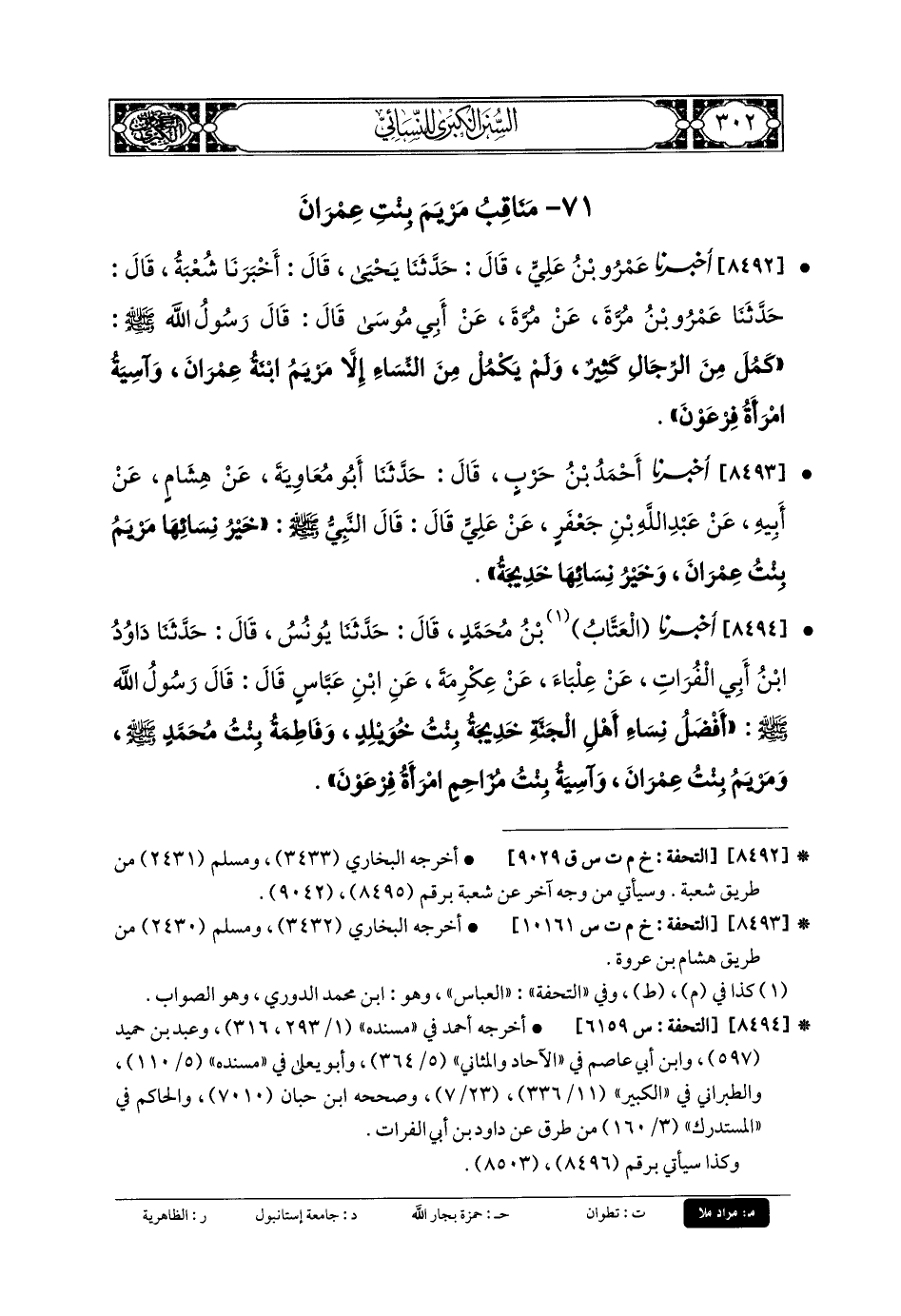 8492 - أَخبَرنا عَمْرُو بنُ عَليٍّ، قَالَ: حَدثنا يَحيَى، قَالَ: حَدثنا شُعبَةُ، قَالَ: حَدثنا عَمْرُو بنُ مُرَّةَ، عَن مُرَّةَ، عَن أَبي مُوسَى قَالَ: قَالَ رَسُولُ اللهِ صَلى الله عَلَيهِ وسَلم: كَمُلَ مِنَ الرِّجَالِ كَثِيرٌ، وَلَمْ يَكْمُلْ مِنَ النِّسَاءِ إِلاَّ مَرْيَمُ ابنَةُ عِمْرَانَ، وَآسِيَةُ امْرَأَةُ فِرْعَوْنَ.