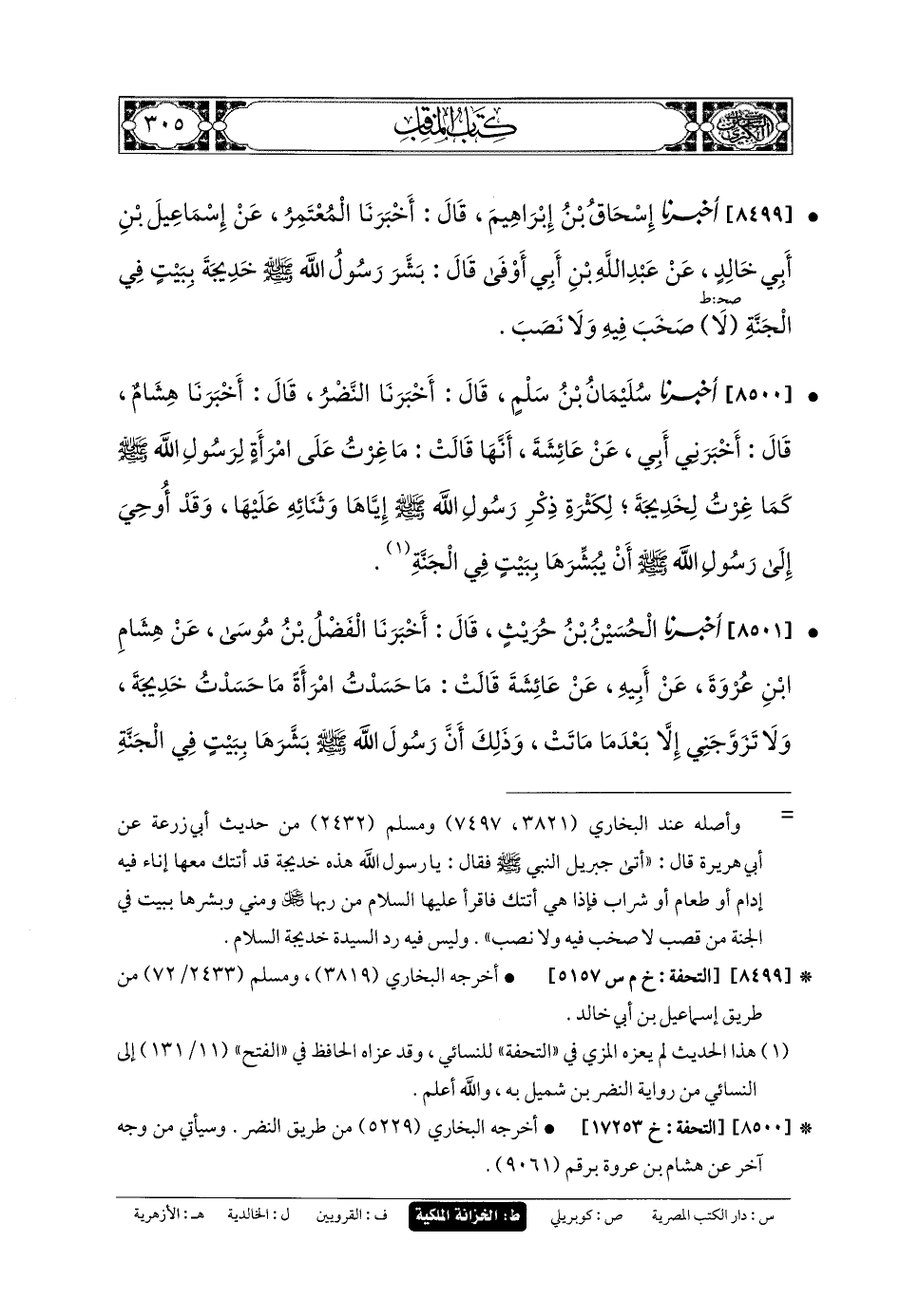 8501 - أَخبَرنا الحُسَيْنُ بنُ حُرَيْثٍ، قَالَ: أَخبَرنا الفَضْلُ بنُ مُوسَى، عَن هِشَامِ بنِ عُرْوَةَ، عَن أَبيهِ، عَن عَائِشَةَ قَالَتْ: مَا حَسَدْتُ امْرَأَةً مَا حَسَدْتُ خَدِيجَةَ، وَلا تَزَوَّجَنِي إِلاَّ بَعْدَ مَا مَاتَتْ، وَذَلِكَ أَنَّ رَسُولَ اللهِ صَلى الله عَلَيهِ وسَلم بَشَّرَهَا بِبَيْتٍ فِي الجَنَّةِ، لا صَخَبَ فِيهِ وَلا نَصَبَ.
