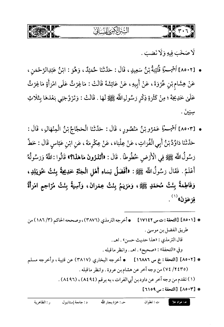 8502 - أَخبَرنا قُتَيبَةُ بنُ سَعِيدٍ، قَالَ: حَدثنا حُمَيْدٌ، وَهُوَ ابنُ عَبدِ الرَّحمَنِ، عَن هِشَامِ بنِ عُرْوَةَ، عَن أَبيهِ، عَن عَائِشَةَ قَالَتْ: مَا غِرْتُ عَلَى امْرَأَةٍ مَا غِرْتُ عَلَى خَدِيجَةَ مِنْ كَثْرَةِ ذِكْرِ رَسُولِ اللهِ صَلى الله عَلَيهِ وسَلم لَهَا، قَالَتْ: وَتَزَوَّجَنِي بَعْدَهَا بِثَلاثِ سِنِينَ.