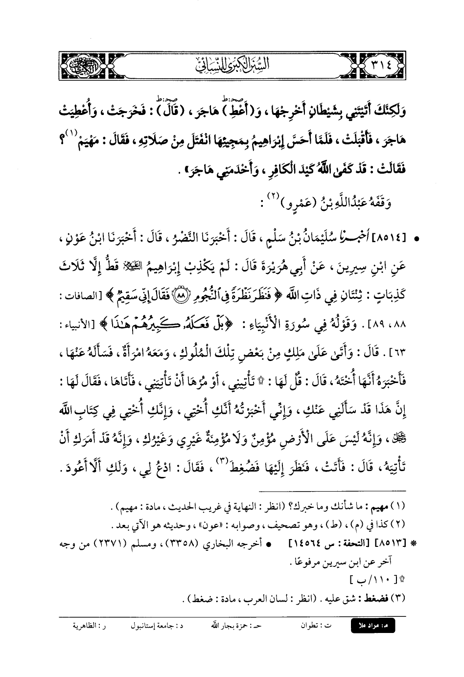 8514 - أَخبَرنا سُلَيمَانُ بنُ سَلْمٍ، قَالَ: أَخبَرنا النَّضْرُ، قَالَ: حَدثنا ابنُ عَوْنٍ، عَنِ ابنِ سِيرِينَ، عَن أَبي هُرَيْرَةَ قَالَ: لَمْ يَكْذِبْ إِبْرَاهِيمُ عَلَيْهِ السَّلامُ قَطُّ إِلاَّ ثَلاثَ كَذَبَاتٍ: ثِنْتَانِ فِي ذَاتِ اللهِ: {فَنَظَرَ نَظْرَةً فِي النُّجُومِ فَقَالَ إِنِّي سَقِيمٌ} وَقَوْلُهُ فِي سُورَةِ الأَنْبِيَاءِ: {قَالَ بَلْ فَعَلَهُ كَبِيرُهُمْ هَذَا} قَالَ: وَأَتَى عَلَى مَلِكٍ مِنْ بَعْضِ تلك المُلُوكِ، وَمَعَهُ امْرَأَةٌ فَسَأَلَهُ عَنهَا، فَأَخْبَرَهُ أَنَّهَا أُخْتُهُ، قَالَ: قُلْ لَهَا: تَأْتِيَنِي، أَوْ مُرْهَا أَنْ تَأْتِيَنِي، فَأَتَاهَا فَقَالَ لَهَا: إِنَّ هَذَا قَدْ سَأَلَنِي عَنكِ، وَإِنِّي أَخْبَرْتُهُ أَنَّكِ أُخْتِي، وَإِنَّكِ أُخْتِي فِي كِتَابِ اللهِ عَزَّ وَجَلَّ، وَإِنَّهُ لَيْسَ عَلَى الأَرْضِ مُؤْمِنٌ وَلا مُؤْمِنَةٌ غَيْرِي وَغَيْرَكِ، وَإِنَّهُ قَدْ أَمَرَكِ أَنْ تَأْتِيهِ، قَالَ: فَأَتَتْ فَنَظَرَ إِلَيْهَا فَضُغِطَ، فَقَالَ: ادْعِي لِي وَلَكِ أَنْ لا أَعُودَ، قَالَ: فَخُلِّيَ عَنهُ، فَعَادَ، قَالَ: فَضُغِطَ مِثْلَهَا، أَوْ أَشَدَّ، قَالَ: ادْعِي لِي، وَلَكِ أَلاَّ أَعُودَ، قَالَ: فَخُلِّيَ عَنهُ، فَأَمَرَ لَهَا بِطَعَامٍ، وَأَخْدَمَهَا جَارِيَةً، يُقَالُ لَهَا: هَاجَرُ، فَلَمَّا أَتَتْ إِبْرَاهِيمُ قَالَ: مَهْيَمْ، فَقَالَتْ: كَفَى اللهُ كَيْدَ الكَافِرِ الفَاجِرِ، وَأَخْدَمَ جَارِيَةً، قَالَ أَبو هُرَيْرَةَ: تِلْكَ أُمُّكُمْ يَا بَنِي مَاءِ السَّمَاءِ، وَمَدَّ بِهَا ابنُ عَوْنٍ صَوْتَهُ.