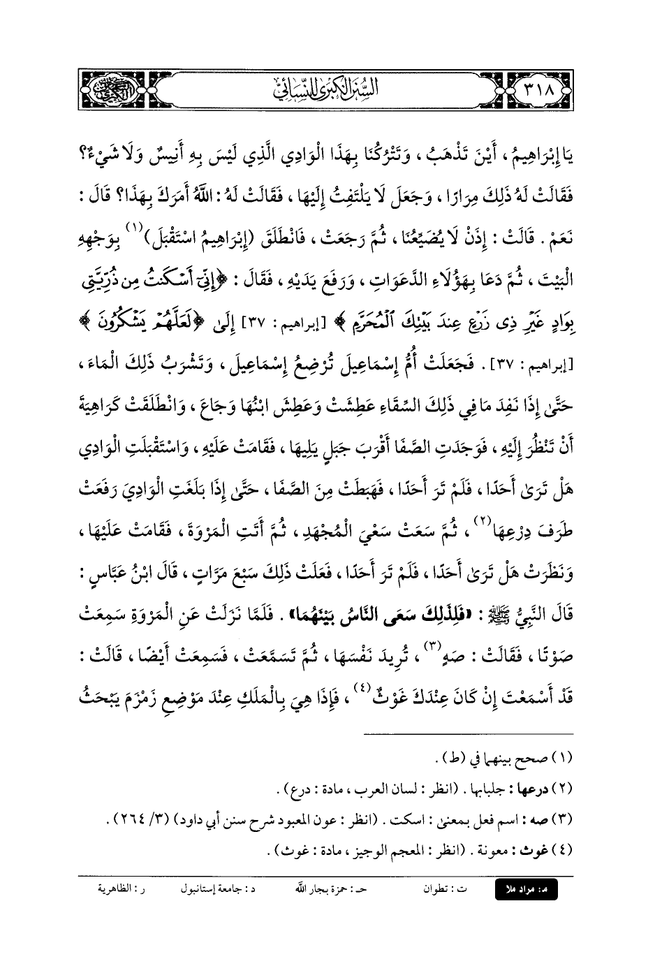 فَقَامَتْ عَلَيْهَا وَنَظَرَتْ هَلْ تَرَى أَحَدًا، فَلَمْ تَرَ أَحَدًا، فَعَلَتْ ذَلِكَ سَبْعَ مَرَّاتٍ، قَالَ ابنُ عَبَّاسٍ: قَالَ النَّبيُّ صَلى الله عَلَيهِ وسَلم: فَلِذَلِكَ سَعَى النَّاسُ بَيْنَهُمَا، فَلَمَّا نَزَلَتْ عَنِ المَرْوَةِ سَمِعَتْ صَوْتًا، فَقَالَتْ: صَهْ، تُرِيدُ نَفْسَهَا، ثُمَّ تَسَمَّعَتْ، فَسَمِعَتْ أَيْضًا قَالَتْ: قَدْ أَسْمَعْتَ إِنْ كَانَ عِنْدَكَ غَوْثٌ، فَإِذَا هِيَ بِالمَلَكِ عِنْدَ مَوْضِعِ زَمْزَمَ يَبْحَثُ بِعَقِبِهِ أَوْ بِجَنَاحِهِ حَتَّى ظَهَرَ المَاءُ، فَجَاءَتْ تُحَوِّضُهُ هَكَذَا وَتَقُولُ بِيَدِهَا، وَجَعَلَتْ، يَعْنِي تَغْرِفُ مِنَ المَاءِ فِي سِقَائِهَا وَهُوَ يَفُورُ بِقَدْرِ مَا تَغْرِفُ، قَالَ ابنُ عَبَّاسٍ: قَالَ النَّبيُّ صَلى الله عَلَيهِ وسَلم: يَرْحَمُ اللهُ أُمَّ إِسمَاعِيلَ، لَوْ تَرَكَتْ زَمْزَمَ، أَوْ قَالَ: لَوْ لَمْ تَغْتَرِفْ مِنَ المَاءِ لَكَانَتْ عَيْنًا مَعِينًا، فَشَرِبَتْ وَأَرْضَعَتْ وَلَدَهَا، فَقَالَ المَلَكُ: لا تَخَافِي الضَّيْعَةَ، فَإِنَّ هَاهُنَا بَيْتَ اللهِ، يَبْنِيهِ هَذَا الغُلامُ وَأَبوهُ، وَإِنَّ اللهَ لا يُضَيِّعُ أَهْلَهُ، وَكَانَ البَيْتُ مُرْتَفِعًا مِنَ الأَرْضِ كَالرَّابِيَةِ، تَأْتِيَهُ السُّيُولُ عَن يَمِينِهِ وَشِمَالِهِ، فَكَانُوا كَذَلِكَ حَتَّى مَرَّتْ رُفْقَةٌ، أَوْ قَالَ: بَيْتٌ مِنْ جُرْهُمٍ مُقْبِلِينَ، فَنَزَلُوا فِي أَسْفَلِ مَكَّةَ، فَرَأَوْا طَائِرًا عَارِضًا، فَقَالُوا: إِنَّ هَذَا الطَّائِرَ لَيَدُورُ عَلَى مَاءٍ، وَلَعَهْدُنَا بِهَذَا الوَادِي وَمَا فِيهِ مَاءٌ، فَأَرْسَلُوا فَإِذَا هُمْ بِالمَاءِ، فَرَجَعُوا فَأَخْبَرُوهُمْ بِالمَاءِ، وَأَمُّ إِسمَاعِيلَ عِنْدَ المَاءِ، فَقَالُوا: أَتَأْذَنِينَ لَنَا أَنْ نَنْزِلَ عِنْدَكِ؟ قَالَتْ: نَعَمْ، وَلا حَقَّ لَكُمْ فِي المَاءِ، قَالَ ابنَ عَبَّاسٍ: قَالَ نَبِيُّ اللهُ صَلى الله عَلَيهِ وسَلم: فَأَلْفَى ذَلِكَ أُمَّ إِسمَاعِيلَ وَهِيَ تُحِبُّ الأُنْسَ، فَنَزَلُوا وَأَرْسَلُوا إِلَى أَهَالِيهِمْ، فَنَزَلُوا مَعَهُمْ، وَشَبَّ الغُلامُ، وَتَعَلَّمَ العَرَبِيَّةَ مِنْهُمْ، وَأَعْجَبَهُمْ حِينَ شَبَّ، فَلَمَّا أَدْرَكَ زَوَّجُوهُ امْرَأَةً مِنْهُمْ، وَمَاتَتْ أُمُّ إِسمَاعِيلَ.