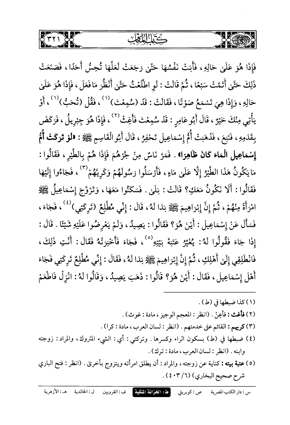 فَقَالُوا: مَا يَكُونُ هَذَا الطَّيْرُ إِلاَّ عَلَى مَاءٍ، فَأَرْسَلُوا رَسُولَهُمْ وَكَرِيَّهُمْ، فَجَاؤُوا إِلَيْهَا فَقَالُوا: أَلا نَكُونُ مَعَكِ؟ قَالَتْ: بَلَى، فَسَكَنُوا مَعَهَا، وَتَزَوَّجَ إِسمَاعِيلُ صَلى الله عَلَيهِ وسَلم امْرَأَةً مِنْهُمْ، ثُمَّ إِنَّ إِبْرَاهِيمَ صَلى الله عَلَيهِ وسَلم بَدَا لَهُ، قَالَ: إِنِّي مُطَّلِعٌ تَرْكَتِي، فَجَاءَ فَسَأَلَ عَن إِسمَاعِيلَ أَيْنَ هُوَ؟ فَقَالُوا: يَصِيدُ، وَلَمْ يَعْرِضُوا عَلَيْهِ شَيْئًا، قَالَ: إِذَا جَاءَ فَقُولُوا لَهُ: يُغَيِّرُ عَتَبَةَ بَيْتِهِ، فَجَاءَ فَأَخْبَرَتْهُ، فَقَالَ: أَنْتِ ذَلِكَ، فَانْطَلِقِي إِلَى أَهْلِكِ، ثُمَّ إِنَّ إِبْرَاهِيمَ صَلى الله عَلَيهِ وسَلم بَدَا لَهُ، فَقَالَ: إِنِّي مُطَّلِعٌ تَرْكَتِي، فَجَاءَ أَهْلَ إِسمَاعِيلَ، فَقَالَ: أَيْنَ هُوَ؟ قَالُوا: ذَهَبَ يَصِيدُ، وَقَالُوا لَهُ: انْزِلْ فَاطْعَمْ، وَاشْرَبْ، قَالَ: وَمَا طَعَامُكُمْ وَشَرَابُكُمْ؟ قَالُوا: طَعَامُنَا اللَّحْمُ، وَشَرَابُنَا المَاءُ، قَالَ: اللهُمَّ بَارِكْ لَهُمْ فِي طَعَامِهِمْ وَشَرَابِهِمْ، قَالَ أَبو القَاسِمِ صَلى الله عَلَيهِ وسَلم: فَلا تَزَالُ فِيهِ بَرَكَةٌ بِدَعْوَةِ إِبْرَاهِيمَ صَلى الله عَلَيهِ وسَلم، ثُمَّ إِنَّ إِبْرَاهِيمَ صَلى الله عَلَيهِ وسَلم بَدَا لَهُ، فَقَالَ: إِنِّي مُطَّلِعٌ تَرْكَتِي، فَجَاءَ فَإِذَا إِسمَاعِيلُ وَرَاءَ زَمْزَمَ، يُصْلِحُ نَبْلاً لَهُ صَلى الله عَلَيهِ وسَلم فَقَالَ: يَا إِسمَاعِيلُ، إِنَّ رَبَّكَ عَزَّ وَجَلَّ قَدْ أَمَرَنِي أَنْ أَبْنِي لَهُ بَيْتًا، قَالَ: أَطِعْ رَبَّكَ، قَالَ: وَقَدْ أَمَرَنِي أَنْ تُعِينَنِي عَلَيْهِ، قَالَ: فَجَعَلَ إِسمَاعِيلُ صَلى الله عَلَيهِ وسَلم يُنَاوِلُ إِبْرَاهِيمَ الحِجَارَةَ وَيَقُولانِ: {رَبَّنَا تَقَبَّلْ مِنَّا إِنَّكَ أَنْتَ السَّمِيعُ العَليمُ} فَلَمَّا أَنْ رُفِعَ البُنْيَانُ، وَضَعُفَ الشَّيْخُ عَن رَفْعِ الحِجَارَةِ فَقَامَ عَلَى المَقَامِ، وَجَعَلَ إِسمَاعِيلُ يُنَاوِلُهُ الحِجَارَةَ وَيَقُولانِ: {رَبَّنَا تَقَبَّلْ مِنَّا إِنَّكَ أَنْتَ السَّمِيعُ العَليمُ}.