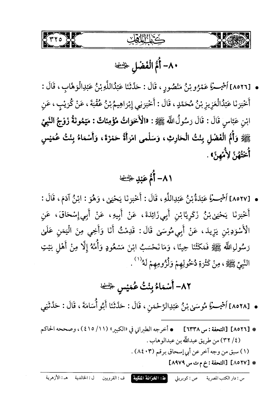 8526- أَخبَرنا عَمْرُو بنُ مَنصُورٍ، قَالَ: حَدثنا عَبدُ اللهِ بنُ عَبدِ الوَهَّابِ، قَالَ: حَدثنا عَبدُ العَزِيزِ بنُ مُحَمدٍ، قَالَ: أَخْبَرَنِي إِبْرَاهِيمُ بنُ عُقْبَةَ، عَن كُرَيْبٍ، عَنِ ابنِ عَبَّاسٍ قَالَ: قَالَ رَسُولُ اللهِ صَلى الله عَلَيهِ وسَلم: الأَخَوَاتُ مُؤْمِنَاتٌ، مَيْمُونَةُ زَوْجُ النَّبيِّ صَلى الله عَلَيهِ وسَلم، وَأَمُّ الفَضْلِ بِنْتُ الحَارِثِ، وَسُلْمَى امْرَأَةُ حَمْزَةَ، وَأَسْمَاءُ بِنْتُ عُمَيْسٍ، أُخْتُهُنَّ لأُمِّهِنَّ.