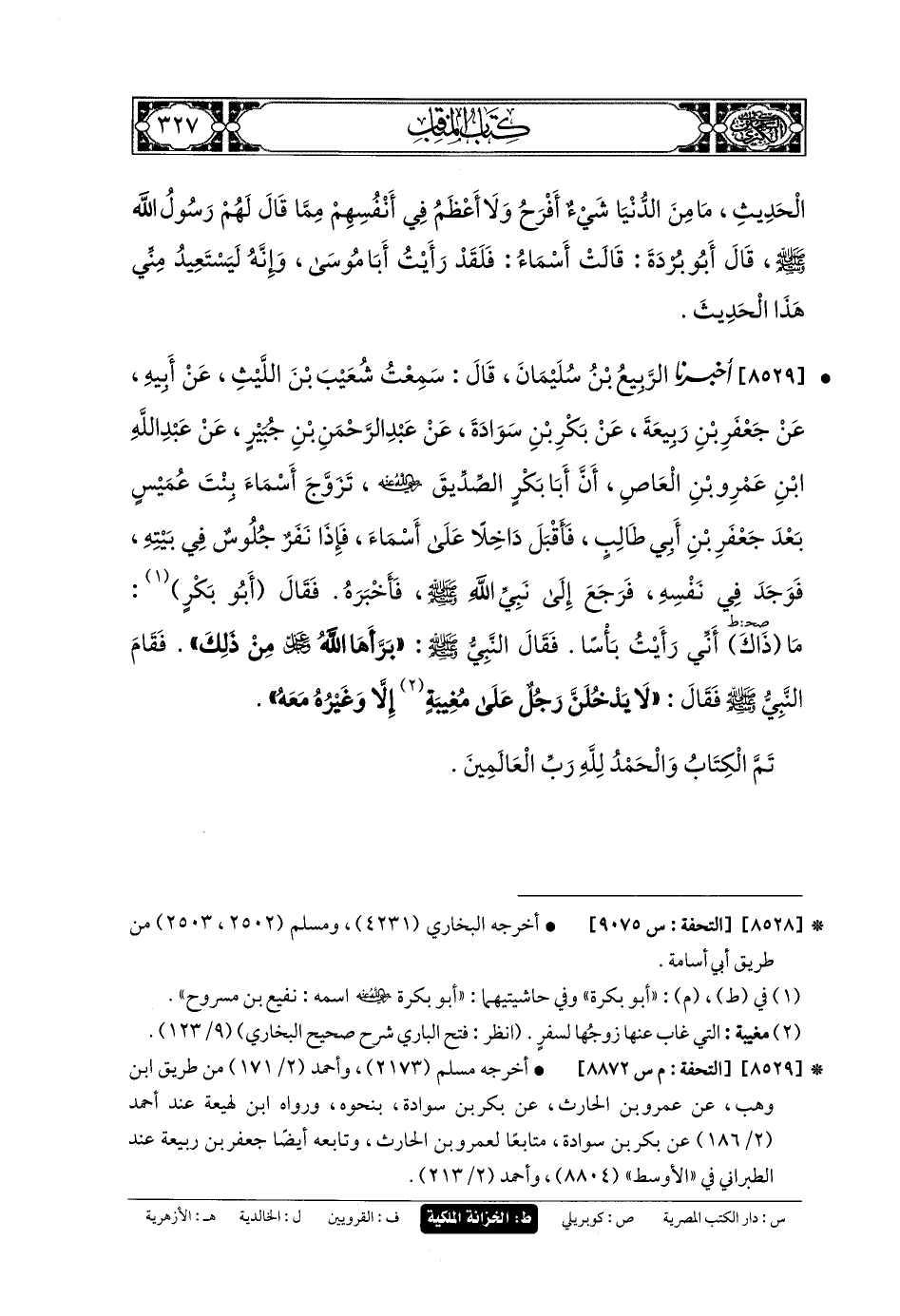 8529 - أَخبَرنا الرَّبِيعُ بنُ سُلَيمَانَ، قَالَ: سَمِعْتُ شُعَيْبَ بْنَ اللَّيْثِ، عَن أَبيهِ، عَن جَعفَرِ بنِ رَبِيعَةَ، عَن بَكْرِ بنِ سَوَادَةَ، عَن عَبدِ الرَّحمَنِ بنِ جُبَيْرٍ، عَن عَبدِ اللهِ بنِ عَمْرِو بنِ العَاصِ، أَنَّ أَبَا بَكْرٍ الصِّدِّيقٍ رَضِيَ اللهُ عَنهُ تَزَوَّجَ أَسْمَاءَ بِنْتَ عُمَيْسٍ، بَعْدَ جَعفَرِ بنِ أَبي طَالِبٍ، فَأَقْبَلَ دَاخِلاً عَلَى أَسْمَاءَ، فَإِذَا نَفَرٌ جُلُوسٌ فِي بَيْتِهِ، فَوَجَدَ فِي نَفْسِهِ، فَرَجَعَ إِلَى نَبِيِّ اللهِ صَلى الله عَلَيهِ وسَلم فَأَخْبَرَهُ، فَقَالَ أَبو بَكْرٍ: مَا ذَاكَ أَنِّي رَأَيْتُ بَأْسًا؟ فَقَالَ النَّبيُّ صَلى الله عَلَيهِ وسَلم: بَرَّأَهَا اللهُ عَزَّ وَجَلَّ مِنْ ذَلِكَ، فَقَامَ النَّبيُّ صَلى الله عَلَيهِ وسَلم فَقَالَ: لا يَدْخُلَنَّ رَجُلٌ عَلَى مُغِيبَةٍ، إِلاَّ وَغَيْرُهُ مَعَهُ.