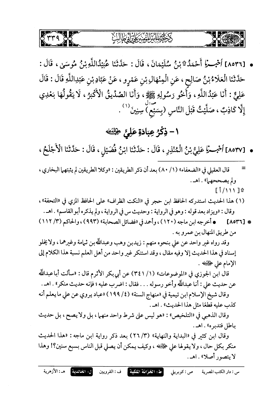 1 - ذِكْرُ عِبَادَةَ عَليٍّ رَضِيَ اللهُ عَنهُ.