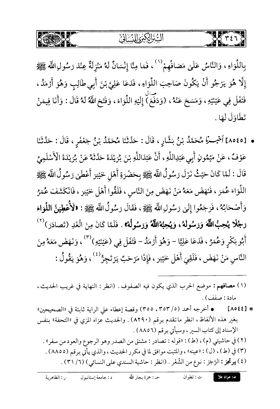 8545 - أَخبَرنا مُحَمدُ بنُ بَشَّارٍ، قَالَ: حَدثنا مُحَمدُ بنُ جَعفَرٍ، قَالَ: حَدثنا عَوْفٌ، عَن مَيْمُونٍ أَبي عَبدِ اللهِ، أَنَّ عَبدَ اللهِ بْنَ بُرَيْدَةَ حَدَّثَهُ، عَن بُرَيْدَةَ الأَسْلَمِيِّ قَالَ: لَمَّا كَانَ حَيْثُ نَزَلَ رَسُولُ اللهِ صَلى الله عَلَيهِ وسَلم بِحَضْرَةِ أَهْلِ خَيْبَرَ، أَعْطَى رَسُولُ اللهِ صَلى الله عَلَيهِ وسَلم اللِّوَاءَ عُمَرَ، فَنَهَضَ مَعَهُ مَنْ نَهَضَ مِنَ النَّاسِ، فَلَقُوا أَهْلَ خَيْبَرَ، فَانْكَشَفَ عُمَرُ وَأَصْحَابُهُ، فَرَجَعُوا إِلَى رَسُولِ اللهِ صَلى الله عَلَيهِ وسَلم، فَقَالَ رَسُولُ اللهِ صَلى الله عَلَيهِ وسَلم: لأُعْطِيَنَّ اللِّوَاءَ رَجُلاً يُحِبُّ اللهَ وَرَسُولَهُ، وَيُحِبُّهُ اللهُ وَرَسُولُهُ، فَلَمَّا كَانَ مِنَ الغَدِ تَصَادَرَ أَبو بَكْرٍ، وَعُمَرُ، فَدَعَا عَليًّا، وَهُوَ أَرْمَدُ، فَتَفَلَ فِي عَيْنَيْهِ، وَنَهَضَ مَعَهُ مِنَ النَّاسِ مَنْ نَهَضَ، فَلَقِيَ أَهْلَ خَيْبَرَ، فَإِذَا مَرْحَبٌ يَرْتَجِزُ وَهُوَ يَقُولُ:.