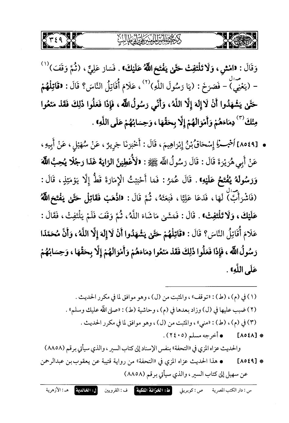 8549 - أَخبَرنا إِسحَاقُ بنُ إِبْرَاهِيمَ، قَالَ: أَخبَرنا جَرِيرٌ، عَن سُهَيلٍ، عَن أَبيهِ، عَن أَبي هُرَيْرَةَ قَالَ: قَالَ رَسُولُ اللهِ صَلى الله عَلَيهِ وسَلم: لأُعْطِيَنَّ الرَّايَةَ غَدًا رَجُلاً يُحِبُّ اللهَ وَرَسُولَهُ، يُفْتَحُ عَلَيْهِ، قَالَ عُمَرُ: فَمَا أَحْبَبْتُ الإِمَارَةَ قَطُّ إِلاَّ يَوْمَئِذٍ، قَالَ: فَاشْرَأَبَّ لَهَا، فَدَعَا عَليًّا فَبَعَثَهُ، ثُمَّ قَالَ: اذْهَبْ فَقَاتِلْ حَتَّى يَفْتَحَ اللهُ عَلَيْكَ، وَلا تَلْتَفِتْ، قَالَ: فَمَشَى مَا شَاءَ اللهُ، ثُمَّ وَقَفَ، فَلَمْ يَلْتَفِتْ، فَقَالَ: عَلامَ أُقَاتِلُ النَّاسَ؟ قَالَ: قَاتِلْهُمْ حَتَّى يَشْهَدُوا أَنَّ لا إِلَهَ إِلاَّ اللهُ، وَأَنَّ مُحَمدًا رَسُولُ اللهِ، فَإِذَا فَعَلُوا ذَلِكَ، فَقَدْ مَنَعُوا دِمَاءَهُمْ وَأَمْوَالَهُمْ إِلاَّ بِحَقِّهَا، وَحِسَابُهُمْ عَلَى اللهِ.
