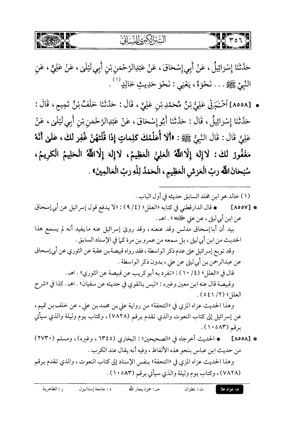 8558 - أَخْبَرَنِي عَليُّ بنُ مُحَمدِ بنِ عَليٍّ، قَالَ: حَدثنا خَلَفُ بنُ تَمِيمٍ، قَالَ: حَدثنا إِسرَائِيلُ، قَالَ: حَدثنا أَبو إِسحَاقَ، عَن عَبدِ الرَّحمَنِ بنِ أَبي لَيْلَى، عَن عَليٍّ، قَالَ: قَالَ النَّبيُّ صَلى الله عَلَيهِ وسَلم: أَلا أُعَلِّمُكَ كَلِمَاتٍ إِذَا قُلْتَهُنَّ غُفِرَ لَكَ، عَلَى أَنَّهُ مَغْفُورٌ لَكَ؟ لا إِلَهَ إِلاَّ اللهُ العَليُّ العَظِيمُ، لا إِلَهَ إِلاَّ اللهُ الحَلِيمُ الكَرِيمُ، سُبْحَانَ اللهِ رَبِّ العَرْشِ العَظِيمِ، الحَمْدُ للهِ رَبِّ العَالَمِينَ.