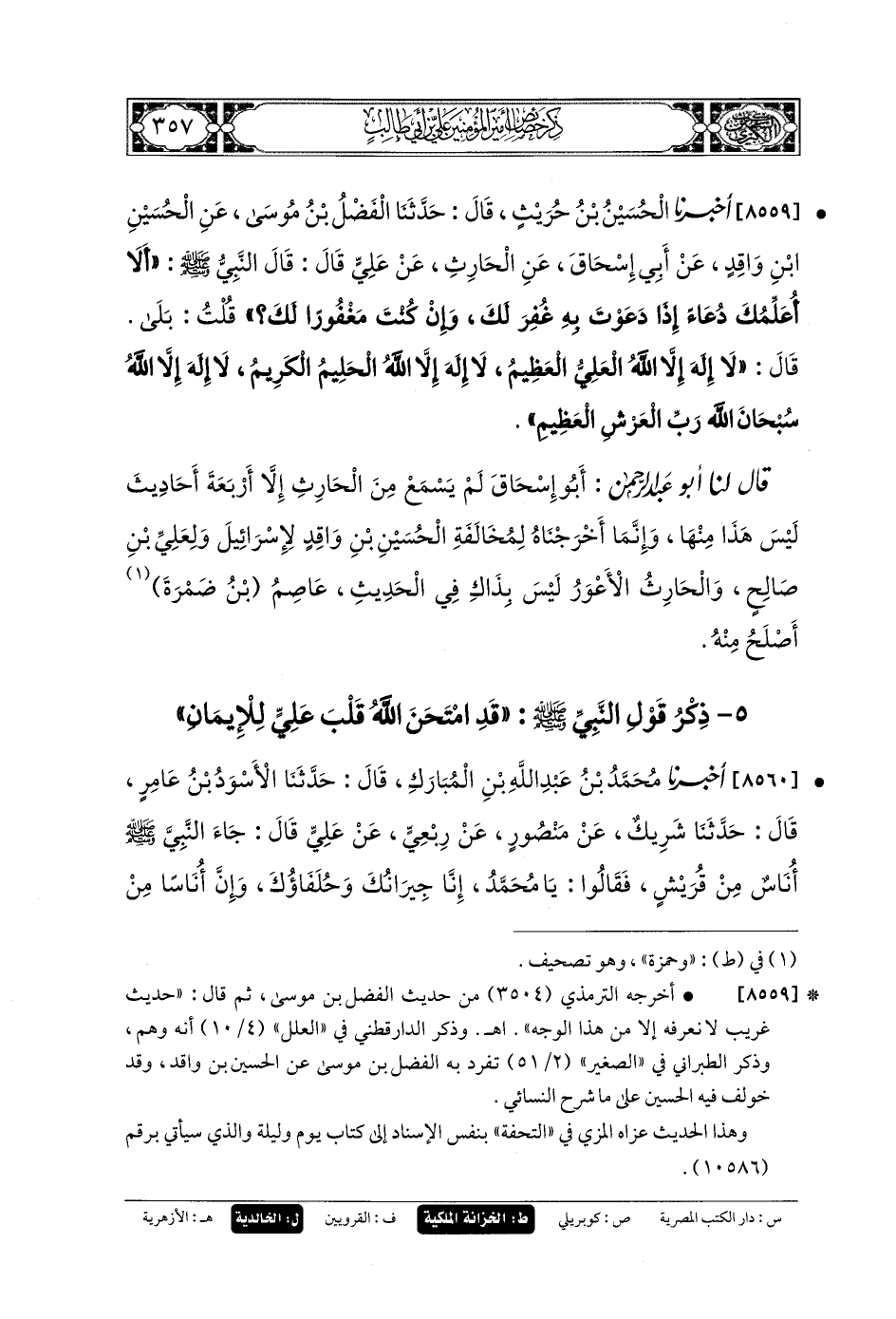 8559 - أَخبَرنا الحُسَيْنُ بنُ حُرَيْثٍ، قَالَ: حَدثنا الفَضْلُ بنُ مُوسَى، عَنِ الحُسَيْنِ بنِ وَاقِدٍ، عَن أَبي إِسحَاقَ، عَنِ الحَارِثِ، عَن عَليٍّ، قَالَ: قَالَ النَّبيُّ صَلى الله عَلَيهِ وسَلم: أَلا أُعَلِّمُكَ دُعَاءً إِذَا دَعَوْتَ بِهِ غُفِرَ لَكَ، وَإِنْ كُنْتَ مَغْفُورًا لَكَ؟ قُلْتُ: بَلَى، قَالَ: لا إِلَهَ إِلاَّ اللهُ العَليُّ العَظِيمُ، لا إِلَهَ إِلاَّ اللهُ الحَلِيمُ الكَرِيمُ، لا إِلَهَ إِلاَّ اللهُ، سُبْحَانَ اللهِ رَبِّ العَرْشِ العَظِيمِ.