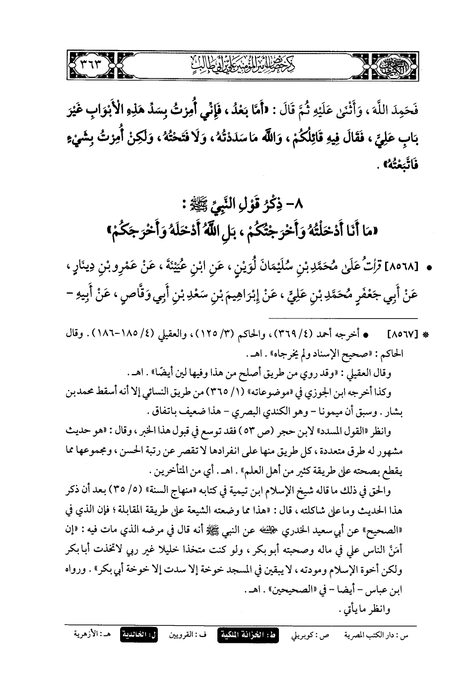 8568 - قَرَأْتُ عَلَى مُحَمدِ بنِ سُلَيمَانَ لُوَيْنٌ، عَنِ ابنِ عُيَيْنَةَ، عَن عَمْرِو بنِ دِينَارٍ، عَن أَبي جَعفَرٍ مُحَمدِ بنِ عَليٍّ، عَن إِبْرَاهِيمَ بنِ سَعْدِ بنِ أَبي وَقَّاصٍ، عَن أَبيهِ، وَلَمْ يَقُلْ مَرَّةً عَن أَبيهِ، قَالَ: كُنَّا عِنْدَ النَّبيِّ صَلى الله عَلَيهِ وسَلم وَعِنْدَهُ قَوْمٌ جُلُوسٌ، فَدَخَلَ عَليٌّ، فَلَمَّا دَخَلَ خَرَجُوا، فَلَمَّا خَرَجُوا تَلاوَمُوا، فَقَالُوا: وَاللهِ مَا أَخَرَجَنَا وَأَدْخَلَهُ، فَرَجَعُوا، فَدَخَلُوا، فَقَالَ: وَاللهِ مَا أَنَا أَدْخَلْتُهُ وَأَخْرَجْتُكُمْ، بَلِ اللهُ أَدْخَلَهُ وَأَخْرَجَكُمْ.