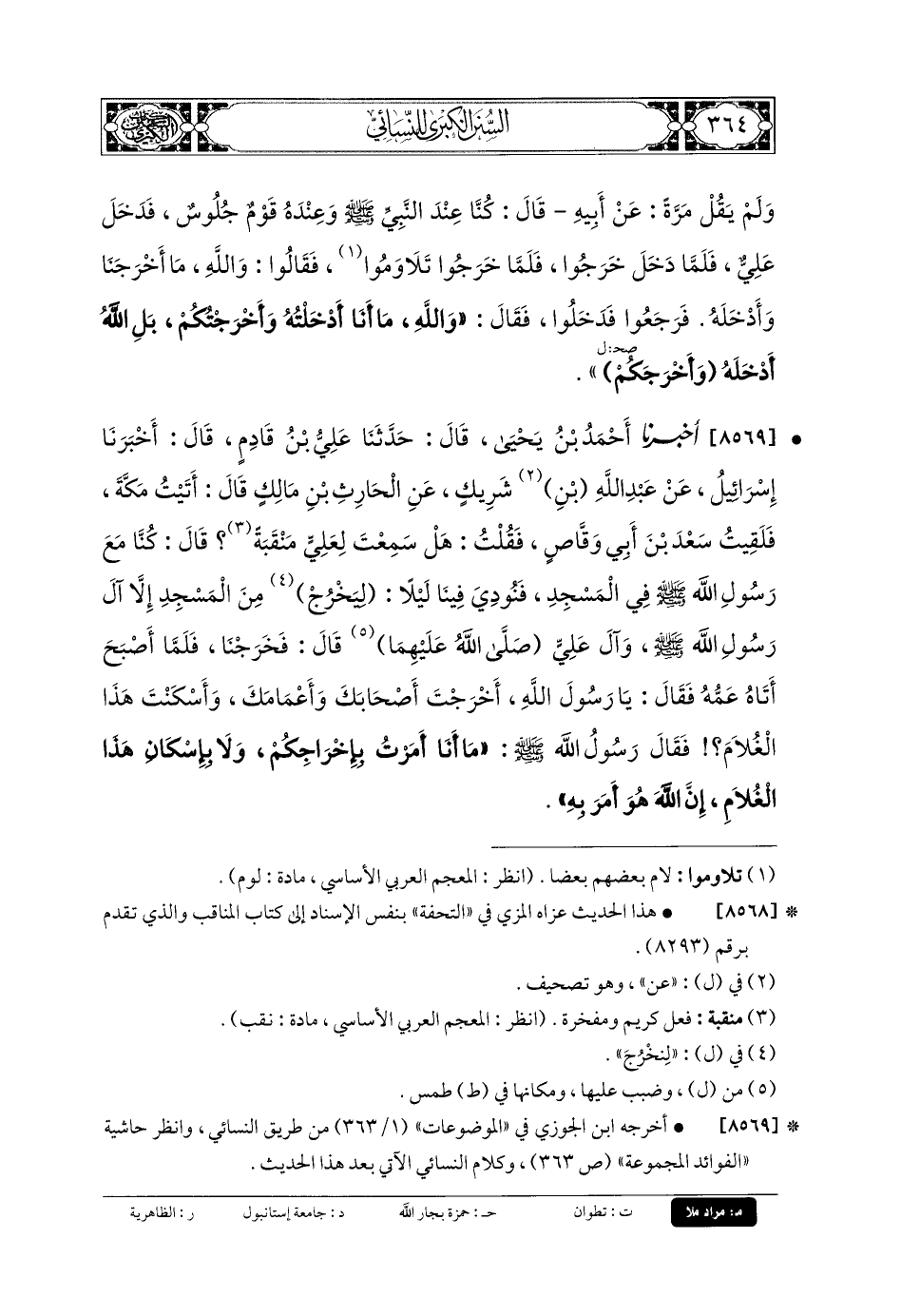 8569 - أَخبَرنا أَحْمَدُ بنُ يَحيَى، قَالَ: حَدثنا عَليُّ بنُ قَادِمٍ، قَالَ: أَخبَرنا إِسرَائِيلُ، عَن عَبدِ اللهِ بنِ شَرِيكٍ، عَنِ الحَارِثِ بنِ مَالِكٍ قَالَ: أَتَيْتُ مَكَّةَ، فَلَقِيتُ سَعْدَ بْنَ أَبي وَقَّاصٍ فَقُلْتُ: هَلْ سَمِعْتَ لِعَليٍّ مَنْقَبَةً؟ قَالَ: كُنَّا مَعَ رَسُولِ اللهِ صَلى الله عَلَيهِ وسَلم فِي المَسْجِدِ، فَنُودِيَ فِينَا لَيْلاً: لِيَخْرُجْ مِنَ المَسْجِدِ إِلاَّ آلُ رَسُولِ اللهِ صَلى الله عَلَيهِ وسَلم، وَآلُ عَليٍّ صَلى الله عَلَيهِما، قَالَ: فَخَرَجْنَا، فَلَمَّا أَصْبَحَ أَتَاهُ عمه (1)، فَقَالَ: يَا رَسُولَ اللهِ، أَخْرَجْتَ أَصْحَابَكَ وَأَعْمَامَكَ وَأَسْكَنْتَ هَذَا الغُلامَ؟ فَقَالَ رَسُولُ اللهِ صَلى الله عَلَيهِ وسَلم: مَا أَنَا أَمَرْتُ بِإِخْرَاجِكُمْ وَلا بِإِسكَانِ هَذَا الغُلامِ، إِنَّ اللهَ هُوَ أَمَرَ بِهِ.