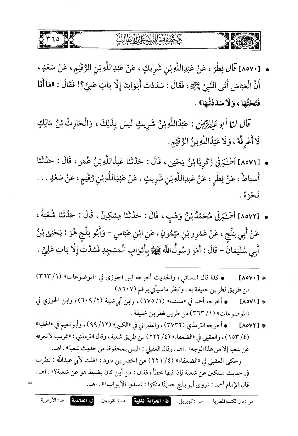 8570 - قَالَ فِطْرٌ: عَن عَبدِ اللهِ بنِ شَرِيكٍ، عَن عَبدِ اللهِ بنِ الرُّقَيْمِ، عَن سَعْدٍ: أَنَّ العَبَّاسَ أَتَى النَّبيَّ صَلى الله عَلَيهِ وسَلم فَقَالَ: سَدَدْتَ أَبْوَابَنَا إِلاَّ بَابَ عَليٍّ؟ فَقَالَ: مَا أَنَا فَتَحْتُهَا وَلا سَدَدْتُهَا.