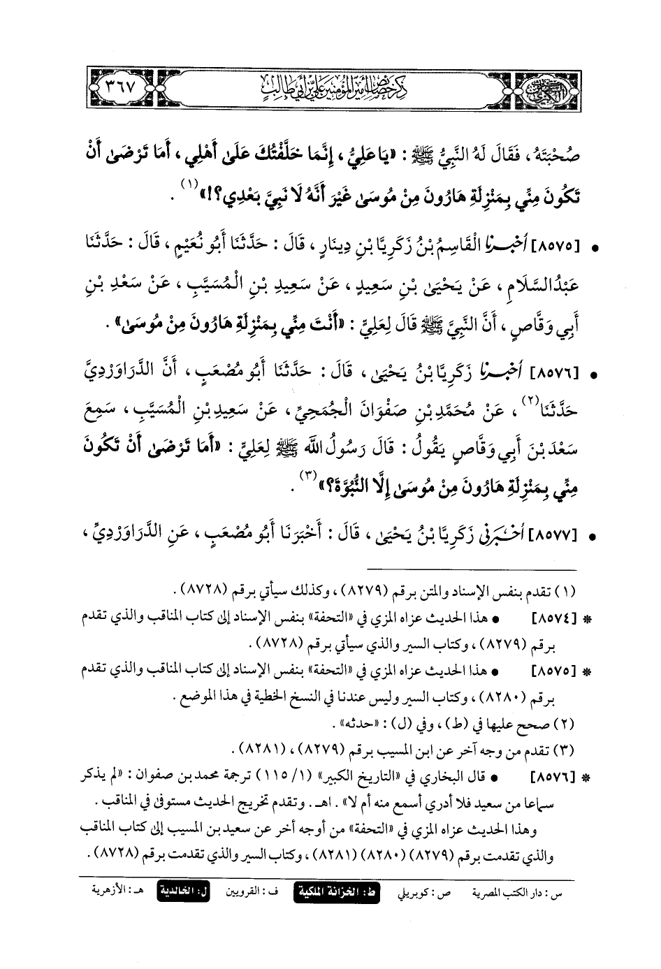 8576 - أَخْبَرَنا زَكَرِيَّا بنُ يَحيَى، قَالَ: حَدثنا أَبو مُصْعَبٍ، أَنَّ الدَّرَاوَرْدِيَّ حَدثنا عَن مُحَمدِ بنِ صَفْوَانَ الجُمَحِيِّ، عَن سَعِيدِ بنِ المُسَيَّبِ، سَمِعَ سَعْدَ بْنَ أَبي وَقَّاصٍ يَقُولُ: قَالَ رَسُولُ اللهِ صَلى الله عَلَيهِ وسَلم لِعَليٍّ: أَمَا تَرْضَى أَنْ تَكُونَ مِنِّي بِمَنْزِلَةِ هَارُونَ مِنْ مُوسَى إِلاَّ النُّبُوَّةَ؟.