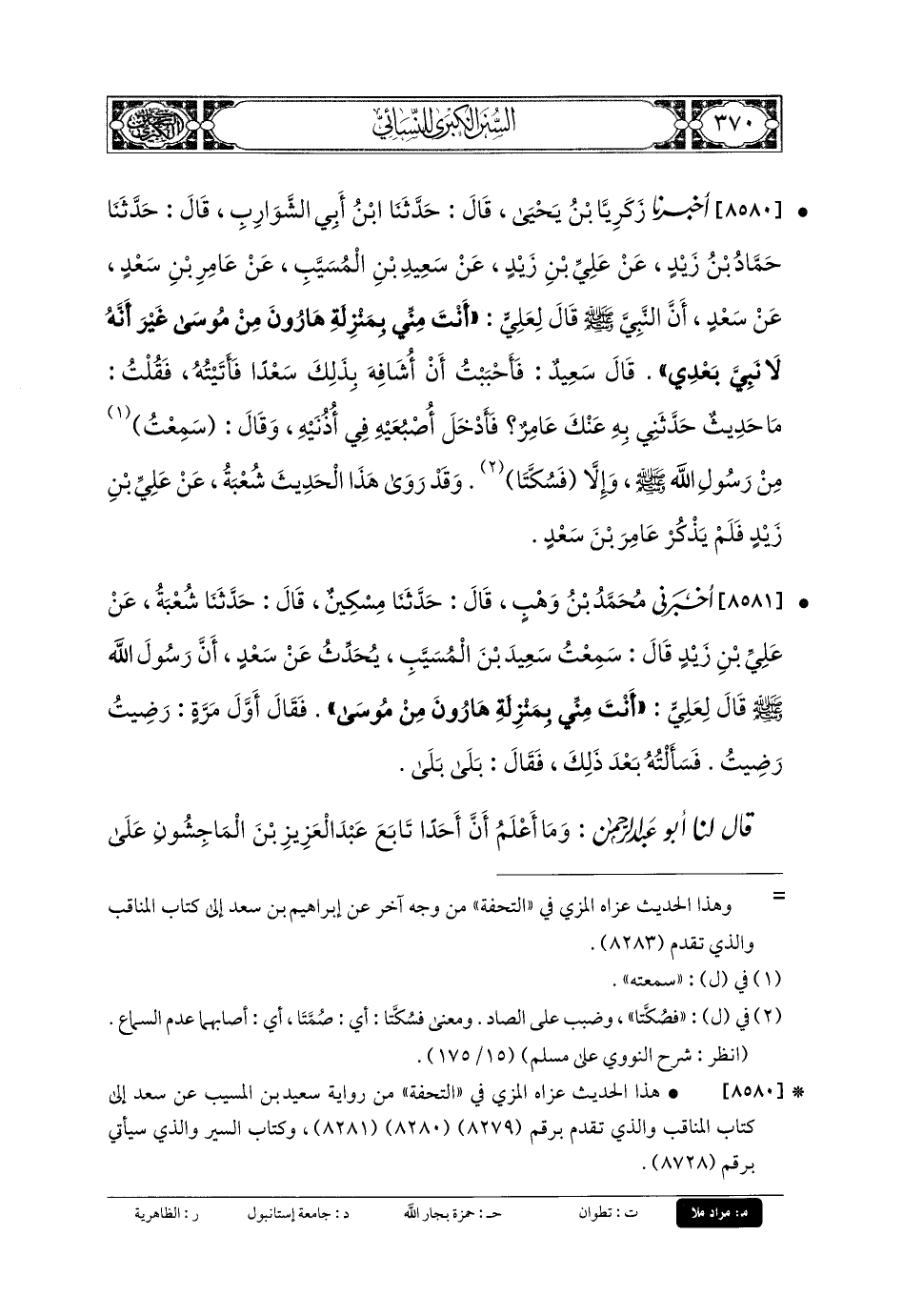 8580 - أَخبَرنا زَكَرِيَّا بنُ يَحيَى، قَالَ: حَدثنا ابنُ أَبي الشَّوَارِبِ، قَالَ: حَدثنا حَمَّادُ بنُ زَيْدٍ، عَن عَليِّ بنِ زَيْدٍ، عَن سَعِيدِ بنِ المُسَيَّبِ، عَن عَامِرِ بنِ سَعْدٍ، عَن سَعْدٍ، أَنَّ النَّبيَّ صَلى الله عَلَيهِ وسَلم قَالَ لِعَليٍّ: أَنْتَ مِنِّي بِمَنْزِلَةِ هَارُونَ مِنْ مُوسَى، غَيْرَ أَنَّهُ لا نَبِيَّ بَعْدِي، قَالَ سَعِيدٌ: فَأَحْبَبْتُ أَنْ أُشَافِهَ بِذَلِكَ سَعْدًا، فَأَتَيْتُهُ فَقُلْتُ: مَا حَدِيثٌ حَدَّثني بِهِ عَنكَ عَامِرٌ، فَأَدْخَلَ أصْبُعَيْهِ فِي أُذُنَيْهِ، وَقَالَ: سَمِعْتُ مِنْ رَسُولِ اللهِ صَلى الله عَلَيهِ وسَلم، وَإِلاَّ فَاسكتَا.