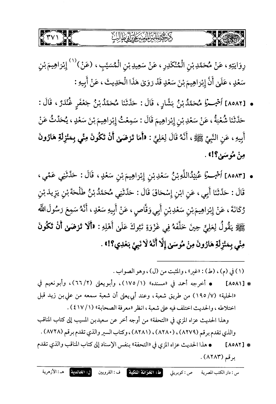 8582 - أَخبَرنا مُحَمدُ بنُ بَشَّارٍ، قَالَ: حَدثنا مُحَمدُ بنُ جَعفَرٍ، غُنْدَرٌ، قَالَ: حَدثنا شُعبَةُ، عَن سَعْدِ بنِ إِبْرَاهِيمَ، قَالَ: سَمِعْتُ إِبْرَاهِيمَ بْنَ سَعْدٍ يُحَدِّثُ عَن أَبيهِ، عَنِ النَّبيِّ صَلى الله عَلَيهِ وسَلم أَنَّهُ قَالَ لِعَليٍّ: أَمَا تَرْضَى أَنْ تَكُونَ مِنِّي بِمَنْزِلَةِ هَارُونَ مِنْ مُوسَى؟.