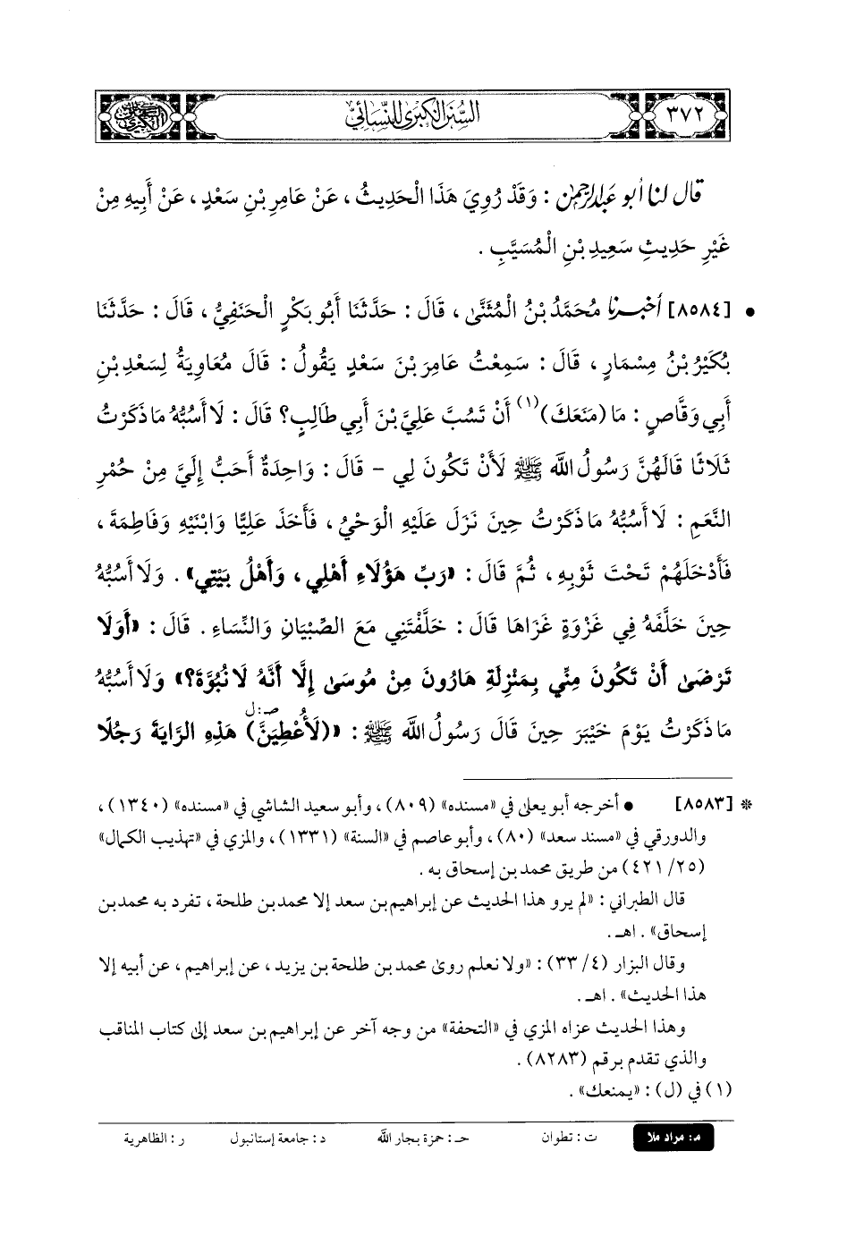 8584 - أَخبَرنا مُحَمدُ بنُ المُثَنَّى، قَالَ: حَدثنا أَبو بَكْرٍ الحَنَفِيُّ، قَالَ: حَدثنا بُكَيْرُ بنُ مِسْمَارٍ، قَالَ: سَمِعْتُ عَامِرَ بْنَ سَعْدٍ يَقُولُ: قَالَ مُعاويَةُ لِسَعْدِ بنِ أَبي وَقَّاصٍ: مَا مَنَعَكَ أَنْ تَسُبَّ عَليَّ بْنَ أَبي طَالِبٍ؟ قَالَ: لا أَسُبُّهُ مَا ذَكَرْتُ ثَلاثًا قَالَهُنَّ رَسُولُ اللهِ صَلى الله عَلَيهِ وسَلم لأَنْ تَكُونَ لِي قَالَ: وَاحِدَةٌ أَحَبَّ إِلَيَّ مِنْ حُمْرِ النَّعَمِ، لا أَسُبُّهُ مَا ذَكَرْتُ حِينَ نَزَلَ عَلَيْهِ الوَحْيُ، فَأَخَذَ عَليًّا وَابْنَيْهِ وَفَاطِمَةَ، فَأَدْخَلَهُمْ تَحْتَ ثَوْبِهِ، ثُمَّ قَالَ: رَبِّ هَؤُلاءِ أَهْلِي وَأَهْلُ بَيْتِي، وَلا أَسُبُّهُ حِينَ خَلَّفَهُ فِي غَزْوَةٍ غَزَاهَا، قَالَ: خَلَّفْتَنِي مَعَ الصِّبْيَانِ وَالنِّسَاءِ؟ قَالَ: أَوَ لا تَرْضَى أَنْ تَكُونَ مِنِّي بِمَنْزِلَةِ هَارُونَ مِنْ مُوسَى، إِلاَّ أَنَّهُ لا نُبُوَّةَ؟ وَلا أَسُبُّهُ مَا ذَكَرْتُ يَوْمَ خَيْبَرَ حِينَ قَالَ رَسُولُ اللهِ صَلى الله عَلَيهِ وسَلم: لأُعْطِيَنَّ هَذِهِ الرَّايَةَ رَجُلاً يُحِبُّ اللهَ وَرَسُولَهُ، وَيَفْتَحُ اللهُ عَلَى يَدَيْهِ، فَتَطَاوَلْنَا، فَقَالَ: أَيْنَ عَليٌّ؟ فَقَالُوا: هُوَ أَرْمَدُ، فَقَالَ: ادْعُوهُ، فَدَعَوْهُ، فَبَصَقَ فِي عَيْنَيْهِ، ثُمَّ أَعْطَاهُ الرَّايَةَ، فَفَتَحَ اللهُ عَلَيْهِ، وَاللهِ مَا ذَكَرَهُ مُعاويَةُ بِحَرْفٍ حَتَّى خَرَجَ مِنَ المَدِينَةِ.
