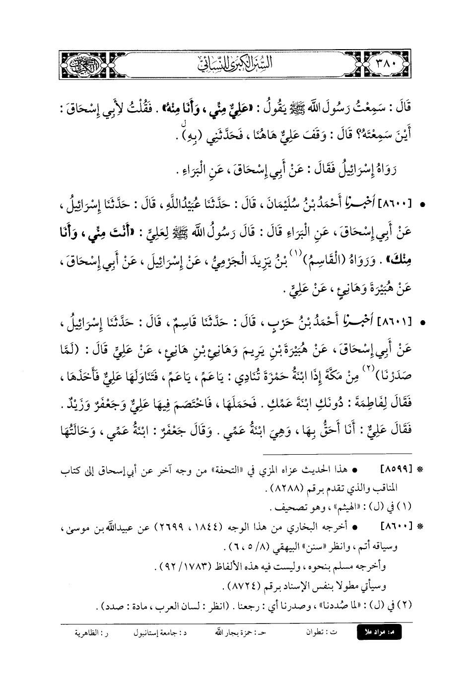 8601 - أَخبَرنا أَحْمَدُ بنُ حَرْبٍ، قَالَ: حَدثنا قَاسِمٌ، قَالَ: حَدثنا إِسرَائِيلُ، عَن أَبي إِسحَاقَ، عَن هُبَيْرَةَ بنِ يَرِيمَ، وَهَانِئِ بنِ هَانِئٍ، عَن عَليٍّ، قَالَ: لَمَّا صَدَرْنَا مِنْ مَكَّةَ إِذَا ابنَةُ حَمْزَةَ تُنَادِي يَا عَمِّ، يَا عَمِّ، فَتَنَاوَلَهَا عَليٌّ فَأَخَذَهَا، فَقَالَ لِفَاطِمَةَ: دُونَكِ ابنَةَ عَمِّكِ، فَحَمَلَهَا فَاخْتَصَمَ فِيهَا عَليٌّ، وَجَعفَرٌ، وَزِيدٌ، فَقَالَ عَليٌّ: أَنَا أَحَقُّ بِهَا، وَهِيَ ابنَةُ عَمِّيَ، وَقَالَ جَعفَرٌ: ابنَةُ عَمِّي، وَخَالَتُهَا تَحْتِي، وَقَالَ زَيْدٌ: بِنْتُ أَخِي، فَقَضَى بِهَا رَسُولُ اللهِ صَلى الله عَلَيهِ وسَلم لِخَالَتِهَا، وَقَالَ: الخَالَةُ بِمَنْزِلَةِ الأُمِّ، وَقَالَ لِعَليٍّ: أَنْتَ مِنِّي، وَأَنَا مِنْكَ، وَقَالَ: لِجَعفَرٍ: أَشْبَهْتَ خَلْقِي وَخُلُقِي، وَقَالَ لِزَيْدٍ: يَا زَيْدُ أَنْتَ أَخُونَا وَمَوْلانَا.