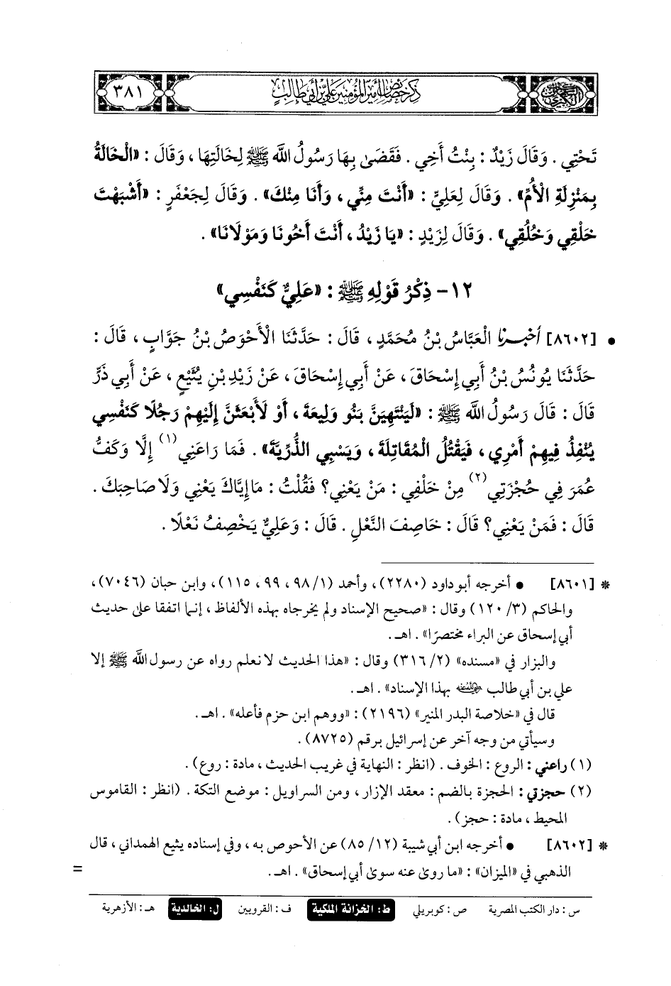 8602 - أَخبَرنا العَبَّاسُ بنُ مُحَمدٍ، قَالَ حَدثنا الأَحْوَصُ بنُ جَوَّابٍ، قَالَ: حَدثنا يُونُسُ بنُ أَبي إِسحَاقَ، عَن أَبي إِسحَاقَ، عَن زَيْدِ بنِ يُثَيْعٍ، عَن أَبي ذَرٍّ قَالَ: قَالَ رَسُولُ اللهِ صَلى الله عَلَيهِ وسَلم: لَيَنْتَهِيَنَّ بَنُو وَلِيعَةَ أَوْ لأَبْعَثَنَّ إِلَيْهِمْ رَجُلاً كَنَفْسِي يُنْفِذُ فِيهِمْ أَمْرِي، فَيَقْتُلَ المُقَاتِلَةُ، وَيَسْبِيَ الذُّرِّيَّةَ، فَمَا رَاعَنِي إِلاَّ وَكَفُّ عُمَرَ فِي حُجْزَتِي مِنْ خَلْفِي مَنْ، يَعْنِي؟ فَقُلْتُ: مَا إِيَّاكَ، يَعْنِي، وَلا صَاحِبَكَ، قَالَ: فَمَنْ، يَعْنِي؟ قَالَ: خَاصِفَ النَّعْلِ، قَالَ: وَعَليٌّ يَخْصِفُ نَعْلاً.