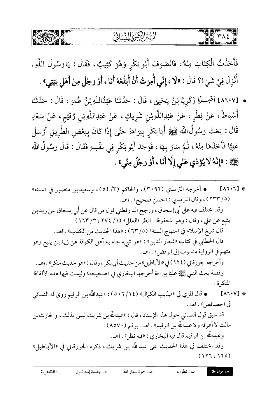 8607 - أَخبَرنا زَكَرِيَّا بنُ يَحيَى، قَالَ: حَدثنا عَبدُ اللهِ بنُ عُمَرَ، قَالَ: حَدثنا أَسْبَاطٌ، عَن فِطْرٍ، عَن عَبدِ اللهِ بنِ شَرِيكٍ، عَن عَبدِ اللهِ بنِ رُقَيْمٍ، عَن سَعْدٍ قَالَ: بَعَثَ رَسُولُ اللهِ صَلى الله عَلَيهِ وسَلم أَبَا بَكْرٍ بِبَرَاءَةَ، حَتَّى إِذَا كَانَ بِبَعْضِ الطَّرِيقِ، أَرْسَلَ عَليًّا فَأَخَذَهَا مِنْهُ، ثُمَّ سَارَ بِهَا، فَوَجَدَ أَبو بَكْرٍ فِي نَفْسِهِ، فَقَالَ: قَالَ رَسُولُ اللهِ صَلى الله عَلَيهِ وسَلم: إِنَّهُ لا يُؤَدِّي عَنِّي إِلاَّ أَنَا أَوْ رَجُلٌ مِنِّي.