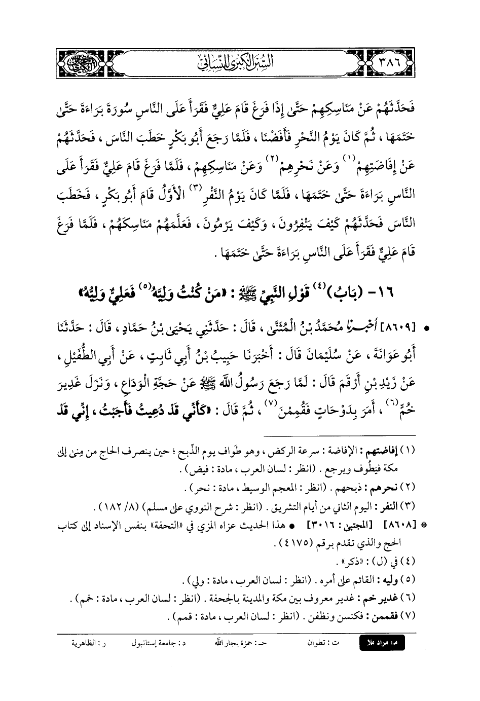 8609 - أَخبَرنا مُحَمدُ بنُ المُثَنَّى، قَالَ: حَدَّثني يَحيَى بنُ حَمَّادٍ، قَالَ: حَدثنا أَبو عَوَانَةَ، عَن سُلَيمَانَ، قَالَ: أَخبَرنا حَبِيبُ بنُ أَبي ثَابِتٍ، عَن أَبي الطُّفَيْلِ، عَن زَيْدِ بنِ أَرْقَمَ قَالَ: لَمَّا رَجَعَ رَسُولُ اللهِ صَلى الله عَلَيهِ وسَلم عَن حَجَّةِ الوَدَاعِ، وَنَزَلَ غَدِيرَ خُمٍّ، أَمَرَ بَدَوْحَاتٍ فَقُمِمْنَ، ثُمَّ قَالَ: كَأَنِّي قَدْ دُعِيتُ، فَأَجَبْتُ، إِنِّي قَدْ تَرَكْتُ فِيكُمُ الثَّقَلَيْنِ، أَحَدُهُمَا أَكْبَرُ مِنَ الآخِرِ: كِتَابُ اللهِ، وَعِتْرَتِي أَهْلَ بَيْتِي، فَانْظُرُوا كَيْفَ تَخْلُفُونِي فِيهِمَا، فَإِنَّهُمَا لَنْ يَتَفَرَّقَا حَتَّى يَرِدَا عَلَيَّ الحَوْضَ، ثُمَّ قَالَ: إِنَّ اللهَ مَوْلايَ، وَأَنَا وَلِيُّ كُلِّ مُؤْمِنٍ، ثُمَّ أَخَذَ بِيَدِ عَليٍّ، فَقَالَ: مَنْ كُنْتُ وَلِيَّهُ، فَهَذَا وَلِيُّهُ، اللهُمَّ وَالِ مَنْ وَالاهُ، وَعَادِ مَنْ عَادَاهُ، فَقُلْتُ لِزَيْدٍ: سَمِعْتَهُ مِنْ رَسُولِ اللهِ صَلى الله عَلَيهِ وسَلم؟ فَقَالَ: مَا كَانَ فِي الدَّوْحَاتِ أَحَدٌ إِلاَّ رَآهُ بِعَيْنَيْهِ، وَسَمِعَهُ بِأُذُنَيْهِ.