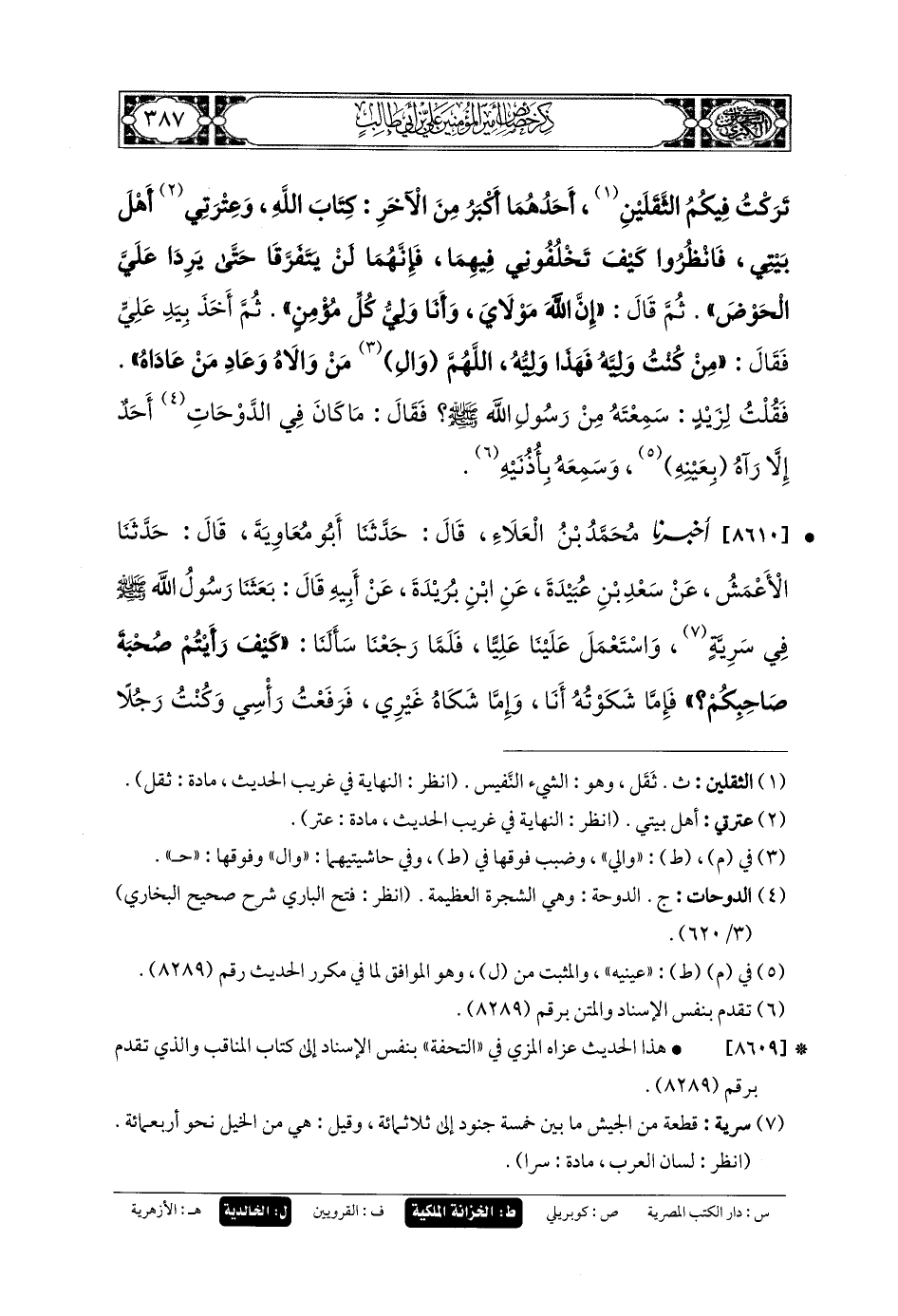 8610 - أَخبَرنا مُحَمدُ بنُ العَلاءِ، قَالَ: حَدثنا أَبو مُعاويَةَ، قَالَ: حَدثنا الأَعْمَشُ، عَن سَعْدِ بنِ عُبَيدَةَ، عَنِ ابنِ بُرَيْدَةَ، عَن أَبيهِ، قَالَ: بَعَثَنَا رَسُولُ اللهِ صَلى الله عَلَيهِ وسَلم فِي سَرِيَّةٍ، وَاسْتَعْمَلَ عَلَيْنَا عَليًّا، فَلَمَّا رَجَعْنَا سَأَلْنَا: كَيْفَ رَأَيْتُمْ صُحْبَةَ صَاحِبِكُمْ؟ فَإِمَّا شَكَوْتُهُ أَنَا، وَإِمَّا شَكَاهُ غَيْرِي، فَرَفَعْتُ رَأْسِي وَكُنْتُ رَجُلاً مِكْبَابًا، فَإِذَا بِوَجْهِ رَسُولِ اللهِ صَلى الله عَلَيهِ وسَلم قَدِ احْمَرَّ، فَقَالَ: مَنْ كُنْتُ وَلِيَّهُ، فَعَليٌّ وَلِيُّهُ.