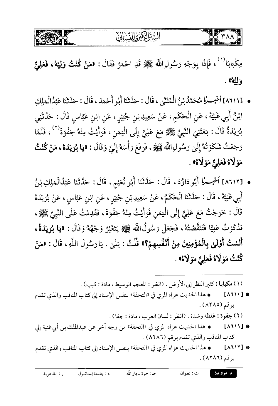 8612 - أَخبَرنا أَبو دَاوُدَ، قَالَ: حَدثنا أَبو نُعَيْمٍ، قَالَ: حَدثنا عَبدُ المَلِكِ بنِ أَبي غَنِيَّةَ، قَالَ: حَدثنا الحَكَمُ، عَن سَعِيدِ بنِ جُبَيْرٍ، عَنِ ابنِ عَبَّاسٍ، عَن بُرَيْدَةَ قَالَ: خَرَجْتُ مَعَ عَليٍّ إِلَى اليَمَنِ، فَرَأَيْتُ مِنْهُ جَفْوَةً، فَقَدِمَتْ عَلَى النَّبيِّ صَلى الله عَلَيهِ وسَلم فَذَكَرْتُ عَليًّا، فَتَنَقَّصْتُهُ، فَجَعَلَ رَسُولُ اللهِ صَلى الله عَلَيهِ وسَلم يَتَغَيَّرُ وَجْهُهُ، وَقَالَ: يَا بُرَيْدَةُ، أَلَسْتُ أَوْلَى بِالمُؤْمِنِينَ مِنْ أَنْفُسِهِمْ؟ قُلْتُ: بَلَى يَا رَسُولَ اللهِ، قَالَ: مَنْ كُنْتُ مَوْلاهُ، فَعَليٌّ مَوْلاهُ.