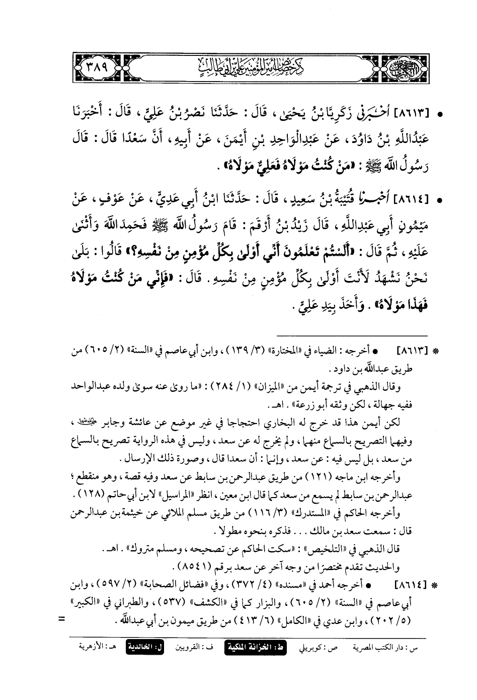 8613 - أَخْبَرَنِي زَكَرِيَّا بنُ يَحيَى، قَالَ: حَدثنا نَصْرُ بنُ عَليٍّ، قَالَ: أَخبَرنا عَبدُ اللهِ بنُ دَاوُدَ، عَن عَبدِ الوَاحِدِ بنِ أَيْمَنَ، عَن أَبيهِ، أَنَّ سَعْدًا قَالَ: قَالَ رَسُولُ اللهِ صَلى الله عَلَيهِ وسَلم: مَنْ كُنْتُ مَوْلاهُ، فَعَليٌّ مَوْلاهُ.