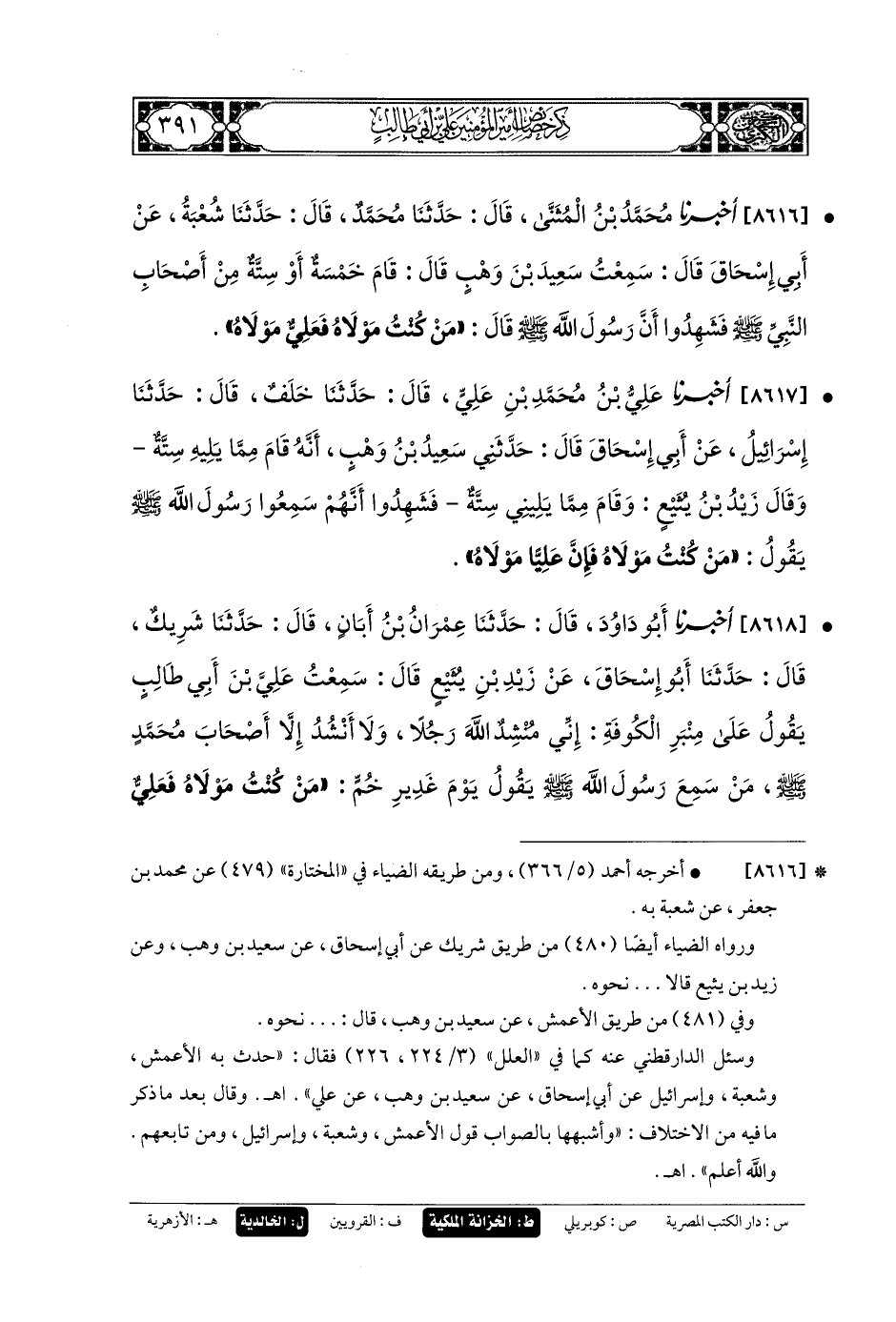 8616 - أَخبَرنا مُحَمدُ بنُ المُثَنَّى، قَالَ: حَدثنا مُحَمدٌ، قَالَ: حَدثنا شُعبَةُ، عَن أَبي إِسحَاقَ، قَالَ: سَمِعْتُ سَعِيدَ بْنَ وَهْبٍ قَالَ: قَامَ خَمْسَةٌ أَوْ سِتَّةٌ مِنْ أَصْحَابِ النَّبيِّ صَلى الله عَلَيهِ وسَلم فَشَهِدُوا أَنَّ رَسُولَ اللهِ صَلى الله عَلَيهِ وسَلم قَالَ: مَنْ كُنْتُ مَوْلاهُ، فَعَليٌّ مَوْلاهُ.