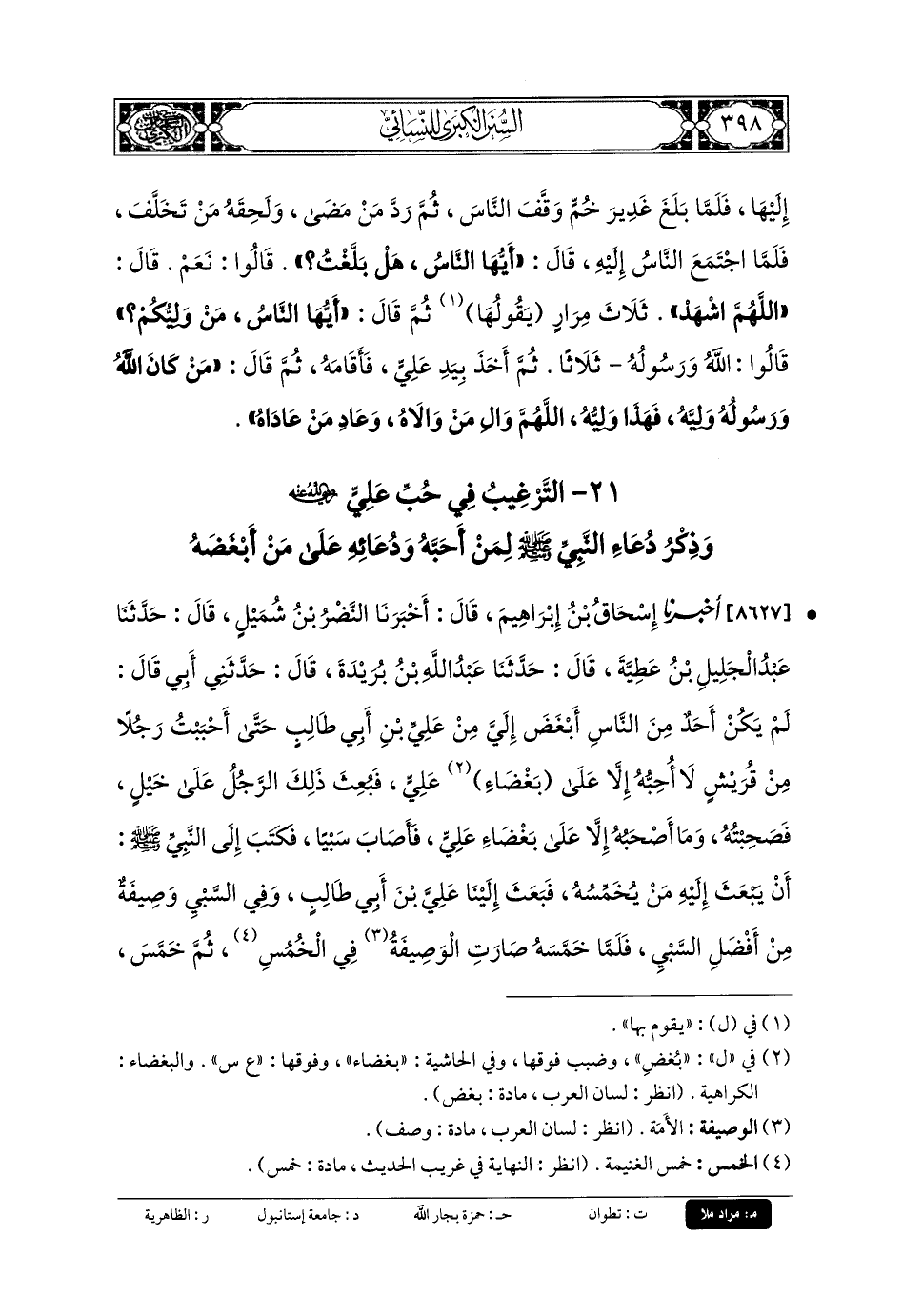 21 - التَّرْغِيبُ فِي حُبِّ عَليٍّ، وَذِكْرِ دُعَاءِ النَّبيِّ صَلى الله عَلَيهِ وسَلم لِمَنْ أَحَبَّهُ، وَدُعَائِهِ عَلَى مَنْ أَبْغَضَهُ.