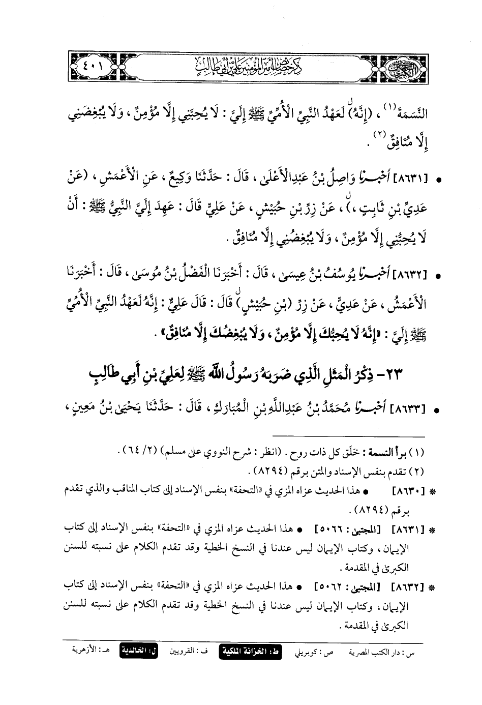 8632 - أَخبَرنا يُوسُفُ بنُ عِيسَى، قَالَ: أَخبَرنا الفَضْلُ بنُ مُوسَى، قَالَ: أَخبَرنا الأَعْمَشُ، عَن عَدِيٍّ، عَن زِرٍّ قَالَ: قَالَ عَليٌّ: إِنَّهُ لَعَهْدُ النَّبيِّ الأُمِّيِّ صَلى الله عَلَيهِ وسَلم إِلَيَّ: إِنَّهُ لا يُحِبُّكَ إِلاَّ مُؤْمِنٌ، وَلا يُبْغِضُكَ إِلاَّ مُنَافِقٌ.