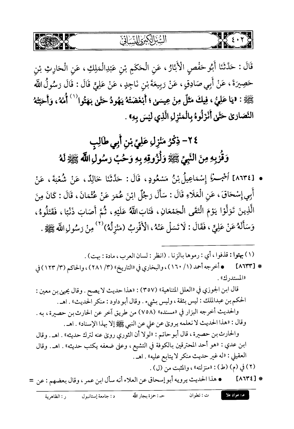 8634 - أَخبَرنا إِسمَاعِيلُ بنُ مَسْعُودٍ، قَالَ: حَدثنا خَالِدٌ، عَن شُعبَةَ، عَن أَبي إِسحَاقَ، عَنِ العَلاءِ قَالَ: سَأَلَ رَجُلٌ ابنَ عُمَرَ عَن عُثْمَانَ قَالَ: كَانَ مِنَ الَّذِينَ تَوَلَّوْا يَوْمَ التَقَى الجَمْعَانِ، فَتَابَ اللهُ عَلَيْهِ، ثُمَّ أَصَابَ ذَنْبًا، فَقَتَلُوهُ، وَسَأَلَهُ عَن عَليٍّ فَقَالَ: لا تَسَلْ عَنهُ، الأقربَ مَنْزِلَه مِنْ رَسُولِ اللهِ صَلى الله عَلَيهِ وسَلم.