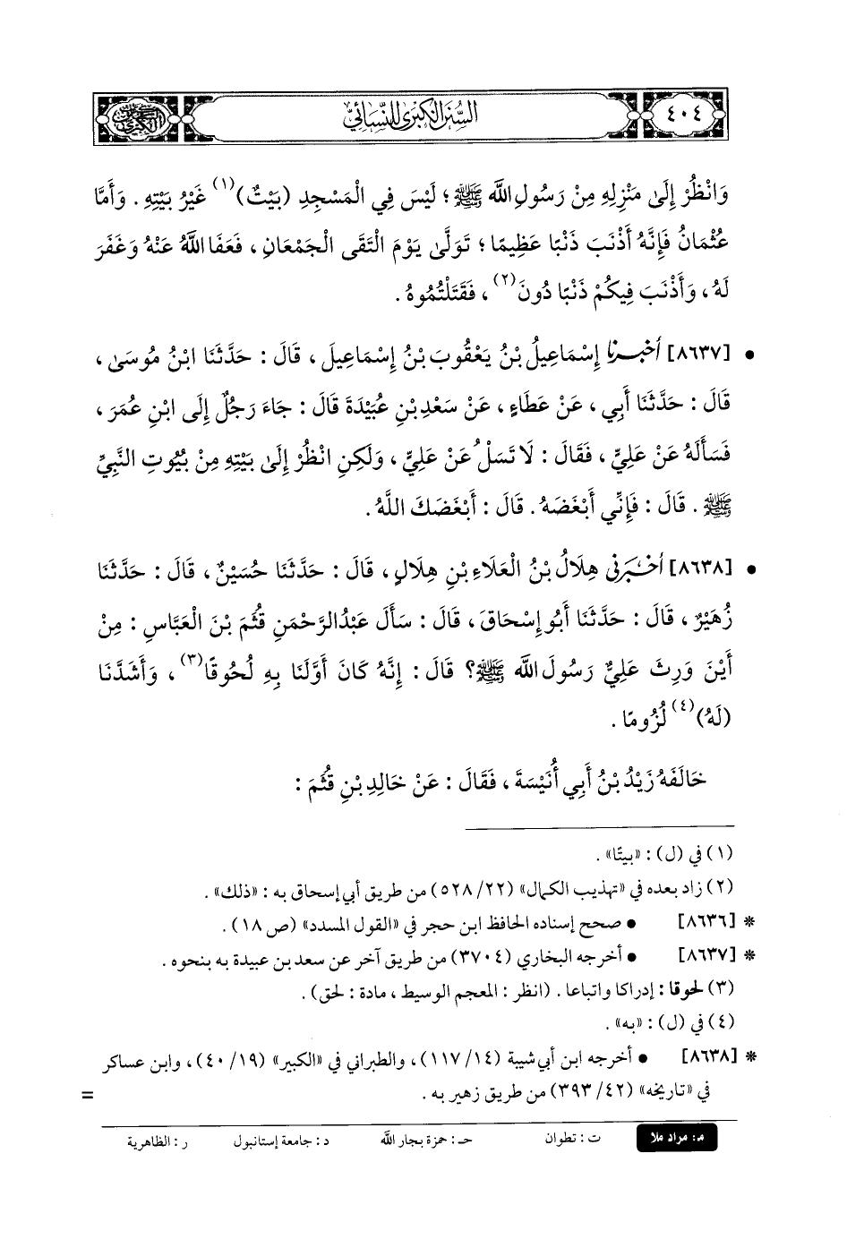 8638 - أَخْبَرَنِي هِلالُ بنُ العَلاءِ بنِ هِلالٍ، قَالَ: حَدثنا حُسَيْنٌ، قَالَ: حَدثنا زُهَيْرٌ، قَالَ: حَدثنا أَبو إِسحَاقَ، قَالَ: سَأَلَ عَبدُ الرَّحمَنِ قُثَمَ بْنَ العَبَّاسِ مِنْ أَيْنَ وَرِثَ عَليٌّ رَسُولَ اللهِ صَلى الله عَلَيهِ وسَلم؟ قَالَ: إِنَّهُ كَانَ أَوَّلَنَا بِهِ لُحُوقًا، وَأَشَدَّنَا لَهُ لُزُومًا.