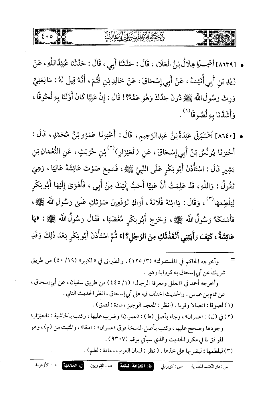 8640 - أَخْبَرَنِي عَبدَةُ بنُ عَبدِ الرَّحِيمِ، قَالَ: أَخبَرنا عَمْرُو بنُ مُحَمدٍ، قَالَ: أَخبَرنا يُونُسُ بنُ أَبي إِسحَاقَ، عَنِ العَيْزَارِ بنِ حُرَيْثِ، عَنِ النُّعْمَانِ بنِ بَشِيرٍ قَالَ: اسْتَأْذَنَ أَبو بَكْرٍ عَلَى النَّبيِّ صَلى الله عَلَيهِ وسَلم، فَسَمِعَ صَوْتَ عَائِشَةَ عَالِيًا، وَهِيَ تَقُولُ: وَاللهِ قَدْ عَلِمْتُ أَنَّ عَليًّا أَحَبُّ إِلَيْكِ مِنْ أَبي، فَأَهْوَى إِلَيْهَا أَبو بَكْرٍ لِيَلْطِمَهَا، وَقَالَ: يَا ابنَةَ فُلانَةَ أَرَاكِ تَرْفَعِينَ صَوْتَكِ عَلَى رَسُولِ اللهِ صَلى الله عَلَيهِ وسَلم، فَأَمْسَكَهُ رَسُولُ اللهِ صَلى الله عَلَيهِ وسَلم، وَخَرَجَ أَبو بَكْرٍ مُغْضَبًا، فَقَالَ رَسُولُ اللهِ صَلى الله عَلَيهِ وسَلم: يَا عَائِشَةُ كَيْفَ رَأَيْتِنِي أَنْقَذْتُكِ مِنَ الرَّجُلِ؟ ثُمَّ اسْتَأْذَنَ أَبو بَكْرٍ بَعْدَ ذَلِكَ، وَقَدِ اصْطَلَحَ رَسُولُ اللهِ صَلى الله عَلَيهِ وسَلم وَعَائِشَةُ، فَقَالَ: أَدْخِلانِي فِي السِّلْمِ كَمَا أَدْخَلْتُمَانِي فِي الحَرْبِ، فَقَالَ رَسُولُ اللهِ صَلى الله عَلَيهِ وسَلم: قَدْ فَعَلْنَا.