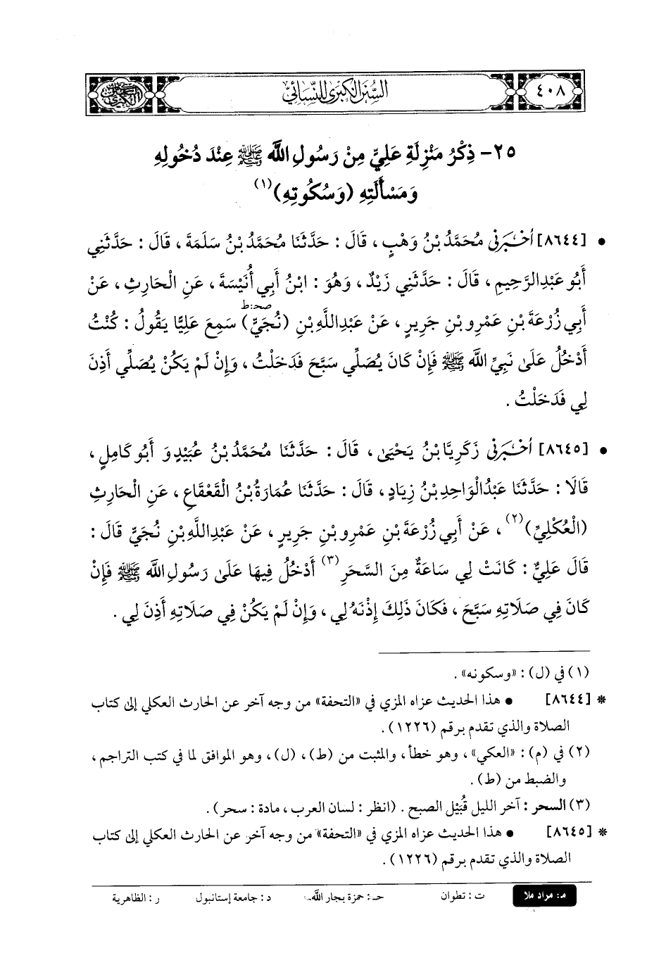 8645 - أَخْبَرَنِي زَكَرِيَّا بنُ يَحيَى، قَالَ: حَدثنا مُحَمدُ بنُ عُبَيدٍ، وَأَبو كَامِلٍ، قَالا: حَدثنا عَبدُ الوَاحِدِ بنُ زِيَادٍ، قَالَ: حَدثنا عُمَارَةُ بنُ القَعْقَاعِ، عَنِ الحَارِثِ العُكْلِيِّ، عَن أَبي زُرْعَةَ بنِ عَمْرِو بنِ جَرِيرٍ، عَن عَبدِ اللهِ بنِ نُجَيٍّ قَالَ: قَالَ عَليٌّ: كَانَتْ لِي سَاعَةٌ مِنَ السَّحَرِ أَدْخُلُ فِيهَا عَلَى رَسُولِ اللهِ صَلى الله عَلَيهِ وسَلم، فَإنْ كَانَ فِي صَلاتِهِ سَبَّحَ، فَكَانَ ذَلِكَ إِذْنُهُ لِي، وَإِنْ لَمْ يَكُنْ فِي صَلاتِهِ أَذِنَ لِي.
