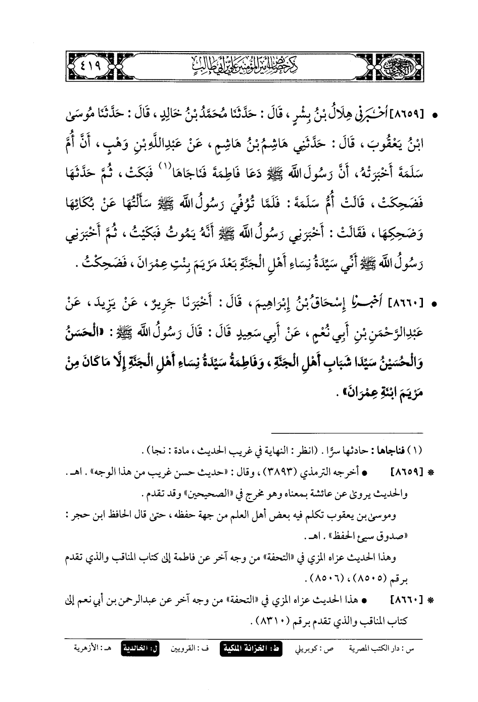 8659 - أَخْبَرَنِي هِلالُ بنُ بِشْرٍ، قَالَ: حَدثنا مُحَمدُ بنُ خَالِدٍ، قَالَ: حَدثنا مُوسَى بنُ يَعْقُوبَ، قَالَ: حَدَّثني هَاشِمُ بنُ هَاشِمٍ، عَن عَبدِ اللهِ بنِ وَهْبٍ، أَنَّ أُمَّ سَلَمَةَ أَخْبَرَتْهُ، أَنَّ رَسُولَ اللهِ صَلى الله عَلَيهِ وسَلم دَعَا فَاطِمَةَ، فَنَاجَاهَا، فَبَكَتْ، ثُمَّ حَدَّثَهَا، فَضَحِكَتْ، قَالَتْ أُمُّ سَلَمَةَ: فَلَمَّا تُوُفِّيَ رَسُولُ اللهِ صَلى الله عَلَيهِ وسَلم سَأَلْتُهَا عَن بُكَائِهَا، وَضَحِكِهَا، فَقَالَتْ: أَخْبَرَنِي رَسُولُ اللهِ صَلى الله عَلَيهِ وسَلم أَنَّهُ يَمُوتُ، ثُمَّ أَخْبَرَنِي رَسُولُ اللهِ صَلى الله عَلَيهِ وسَلم أَنِّي سَيِّدَةُ نِسَاءِ أَهْلِ الجَنَّةِ بَعْدَ مَرْيَمَ بِنْتِ عِمْرَانَ، فَضَحِكْتُ.