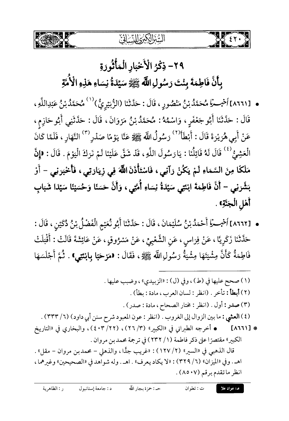 8662 - أَخبَرنا أَحْمَدُ بنُ سُلَيمَانَ، قَالَ: حَدثنا أَبو نُعَيْمٍ الفَضْلُ بنُ دُكَيْنٍ، قَالَ: حَدثنا زَكَرِيَّا، عَن فِرَاسٍ، عَنِ الشَّعْبِيِّ، عَن مَسْرُوقٍ، عَن عَائِشَةَ قَالَتْ: أَقْبَلَتْ فَاطِمَةُ كَأَنَّ مِشْيَتَهَا مِشْيَةُ رَسُولِ اللهِ صَلى الله عَلَيهِ وسَلم فَقَالَ: مَرْحَبًا بِابْنَتِي، ثُمَّ أَجْلَسَهَا عَن يَمِينِهِ أَوْ عَن شِمَالِهِ، ثُمَّ أَسَرَّ إِلَيْهَا حَدِيثًا، فَبَكَتْ، فَقُلْتُ لَهَا: اسْتَخَصَّكِ رَسُولُ اللهِ صَلى الله عَلَيهِ وسَلم بِحَدِيثِهِ وَتَبْكِينَ؟ ثُمَّ إِنَّهُ أَسَرَّ إِلَيْهَا حَدِيثًا، فَضَحِكَتْ، فَقُلْتُ لَهَا: مَا رَأَيْتُ كَاليَوْمِ فَرَحًا أَقْرَبَ مِنْ حُزْنٍ، وَسَأَلْتُهَا عَمَّا قَالَ، فَقَالَتْ: مَا كُنْتُ لأُفْشِيَ سِرَّ رَسُولِ اللهِ صَلى الله عَلَيهِ وسَلم، حَتَّى إِذَا قُبِضَ، سَأَلْتُهَا فَقَالَتْ: إِنَّهُ أَسَرَّ إِلَيَّ فَقَالَ: إِنَّ جِبْرِيلَ كَانَ يُعَارِضُنِي بِالقُرْآنِ كُلَّ سَنَةٍ مَرَّةً، وَإِنَّهُ عَارَضَنِي بِهِ العَامَ مَرَّتَيْنِ، وَلا أُرَانِي إِلاَّ قَدْ حَضَرَ أَجْلِي، وَإِنَّكِ أَوَّلُ أَهْلِ بَيْتِي لَحَاقًا بِي، وَنِعْمَ السَّلَفُ أَنَا لَكِ، قَالَتْ: فَبَكَيْتُ لِذَلِكَ، ثُمَّ قَالَ: أَمَا تَرْضَيْنَ أَنْ تَكُونِي سَيِّدَةَ نِسَاءِ هَذِهِ الأُمَّةِ أَوْ نِسَاءِ المُؤْمِنِينَ؟ قَالَتْ: فَضَحِكْتُ.