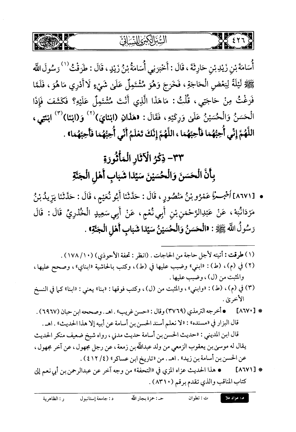 8671 - أَخبَرنا عَمْرُو بنُ مَنصُورٍ، قَالَ: حَدثنا أَبو نُعَيْمٍ، قَالَ: حَدثنا يَزِيدُ بنُ مَرْدَانُبَه، عَن عَبدِ الرَّحمَنِ بنِ أَبي نُعْمٍ، عَن أَبي سَعِيدٍ الخُدْرِيِّ قَالَ: قَالَ رَسُولُ اللهِ صَلى الله عَلَيهِ وسَلم: الحَسَنُ وَالحُسَيْنُ سَيِّدَا شَبَابِ أَهْلِ الجَنَّةِ.