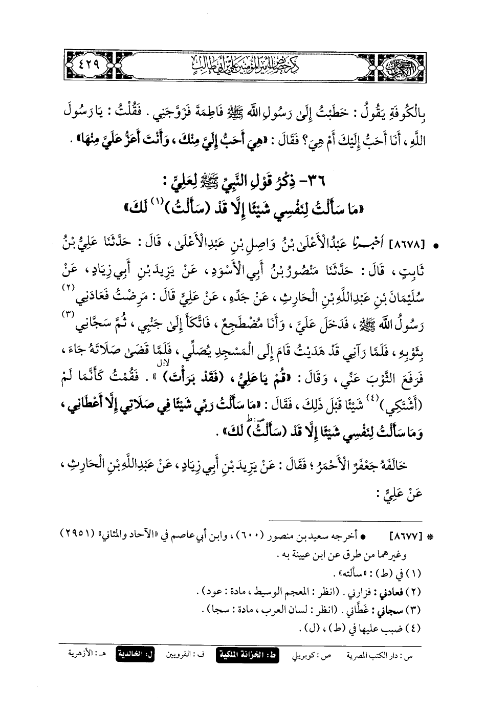 36 - ذِكْرُ قَوْلِ النَّبيِّ صَلى الله عَلَيهِ وسَلم لِعَليٍّ: مَا سَأَلْتُ لِنَفْسِي شَيْئًا إِلاَّ قَدْ سَأَلْتُ لَكَ.