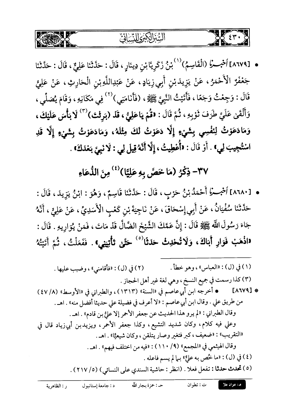 8680 - أَخبَرنا أَحْمَدُ بنُ حَرْبٍ، قَالَ: حَدثنا قَاسِمٌ، وَهُوَ ابنُ يَزِيدَ، قَالَ: حَدثنا سُفيانُ، عَن أَبي إِسحَاقَ، عَن نَاجِيَةَ بنِ كَعْبٍ الأَسَدِيِّ، عَن عَليٍّ، أَنَّهُ جَاءَ رَسُولَ اللهِ صَلى الله عَلَيهِ وسَلم قَالَ: إِنَّ عَمَّكَ الشَّيْخَ الضَّالَّ قَدْ مَاتَ، فَمَنْ يُوَارِيهِ؟ قَالَ: اذْهَبْ فَوَارِ أَبَاكَ، وَلا تُحْدِثْ حَدَثًا حَتَّى تَأْتِيَنِي، فَفَعَلْتُ، ثُمَّ أَتَيْتُهُ، فَأَمَرَنِي أَنْ أَغْتَسِلَ، فَاغْتَسَلْتُ، وَدَعَا لِي بِدَعَوَاتٍ مَا يَسُرُّنِي مَا عَلَى الأَرْضِ بِشَيْءٍ مِنْهُنَّ.