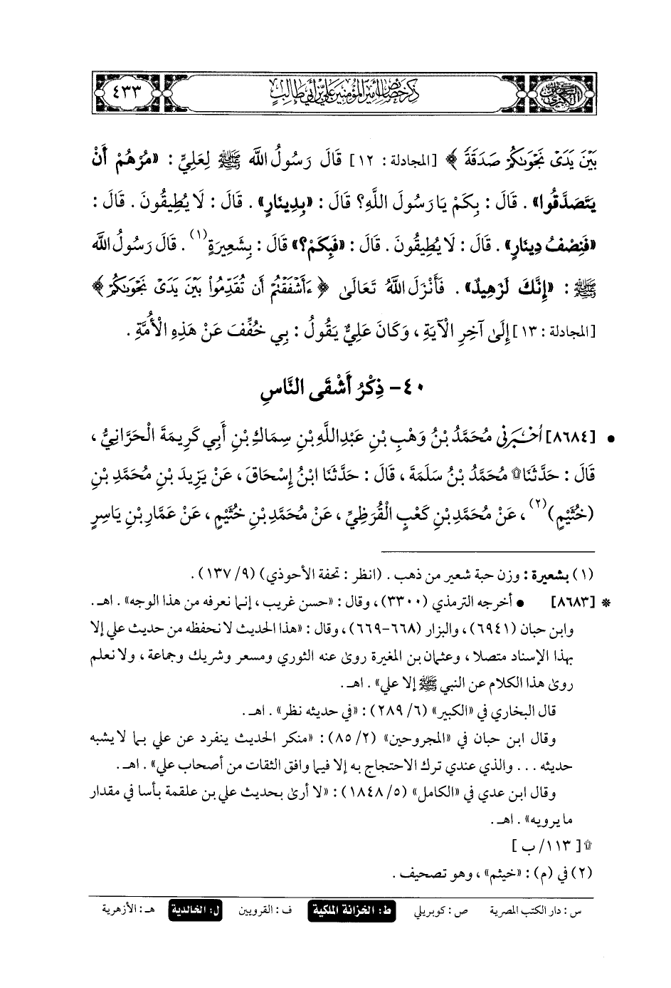 8684 - أَخْبَرَنِي مُحَمدُ بنُ وَهْبِ بنِ عَبدِ اللهِ بنِ سِمَاكِ بنِ أَبي كَرِيمَةَ الحَرَّانِيُّ، قَالَ: حَدثنا مُحَمدُ بنُ سَلَمَةَ، قَالَ: حَدثنا ابنُ إِسحَاقَ، عَن يَزِيدَ بنِ مُحَمدِ بنِ خُثَيْمٍ، عَن مُحَمدِ بنِ كَعْبٍ القُرَظِيِّ، عَن مُحَمدِ بنِ خُثَيْمٍ، عَن عَمَّارِ بنِ يَاسِرٍ، قَالَ: كُنْتُ أَنَا وَعَليُّ بنُ أَبي طَالِبٍ رَفِيقَيْنِ فِي غَزْوَةٍ، فَلَمَّا نَزَلَهَا رَسُولُ اللهِ صَلى الله عَلَيهِ وسَلم وَأَقَامَ بِهَا، رَأَيْنَا أُنَاسًا مِنْ بَنِي مُدْلِجٍ يَعْمَلُونَ فِي عَيْنٍ لَهُمْ، أَوْ فِي نَخْلٍ، فَقَالَ لِي عَليٌّ: يَا أَبَا اليَقْظَانِ، هَلْ لَكَ أَنْ نَأْتِيَ هَؤُلاءِ، فَنَنْظُرَ كَيْفَ يَعْمَلُونَ؟ قَالَ: قُلْتُ: إِنْ شِئْتَ، فَجِئْنَاهُمْ، فَنَظَرْنَا إِلَى عَمَلِهِمْ سَاعَةً، ثُمَّ غَشِيَنَا النَّوْمُ، فَانْطَلَقْتُ أَنَا وَعَليٌّ حَتَّى اضْطَجَعْنَا فِي ظِلِّ صُورٍ مِنَ النَّخْلِ، وَدَقْعَاءَ مِنَ التُّرَابِ، فَنِمْنَا، فَوَاللَّهِ مَا أَنْبَهَنَا إِلاَّ رَسُولُ اللهِ صَلى الله عَلَيهِ وسَلم يُحَرِّكُنَا بِرِجْلِهِ، وَقَدْ تَتَرَّبْنَا مِنْ تِلْكِ الدَّقْعَاءِ الَّتِي نِمْنَا فِيهَا، فَيَوْمَئِذٍ قَالَ رَسُولُ اللهِ صَلى الله عَلَيهِ وسَلم لِعَليٍّ: مَا لَكَ يَا أَبَا تُرَابٍ؟ لِمَا يَرَى عَلَيْهِ مِنَ التُّرَابِ، ثُمَّ قَالَ: أَلا أُحَدِّثُكُمَا بِأَشْقَى النَّاسِ؟ قُلْنَا: بَلَى يَا (رَسُولَ اللهِ، قَالَ: أُحَيْمِرُ) (1)، ثَمُودُ الَّذِي عَقَرَ النَّاقَةَ، وَالَّذِي يَضْرِبُكَ يَا عَليُّ عَلَى هَذِهِ، وَوَضَعَ يَدَهُ عَلَى قَرْنِهِ حَتَّى يَبُلَّ مِنْهَا هَذِهِ، وَأَخَذَ بِلِحْيَتِهِ.