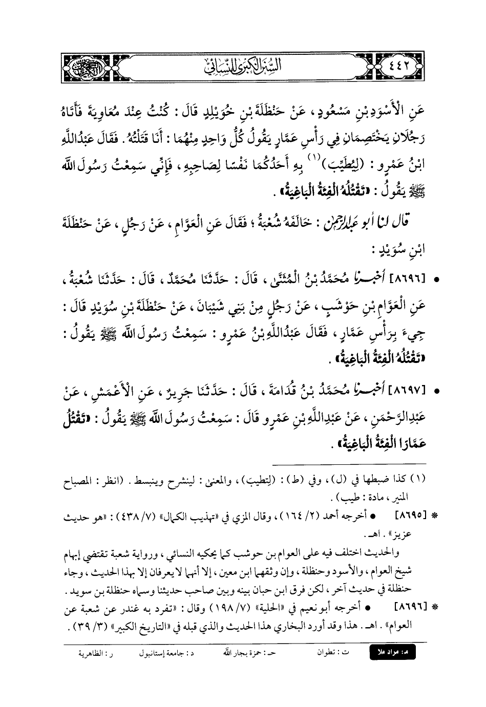 8696 - أَخبَرنا مُحَمدُ بنُ المُثَنَّى، قَالَ: حَدثنا مُحَمدٌ، قَالَ: حَدثنا شُعبَةُ، عَنِ العَوَّامِ بنِ حَوْشَبٍ، عَن رَجُلٍ مِنْ بَنِي شَيْبَانَ، عَن حَنْظَلَةَ بنِ سُوَيْدٍ قَالَ: جِيءَ بِرَأْسِ عَمَّارٍ، فَقَالَ عَبدُ اللهِ بنُ عَمْرٍو: سَمِعْتُ رَسُولَ اللهِ صَلى الله عَلَيهِ وسَلم يَقُولُ: تَقْتُلُهُ الفِئَةُ البَاغِيَةُ.