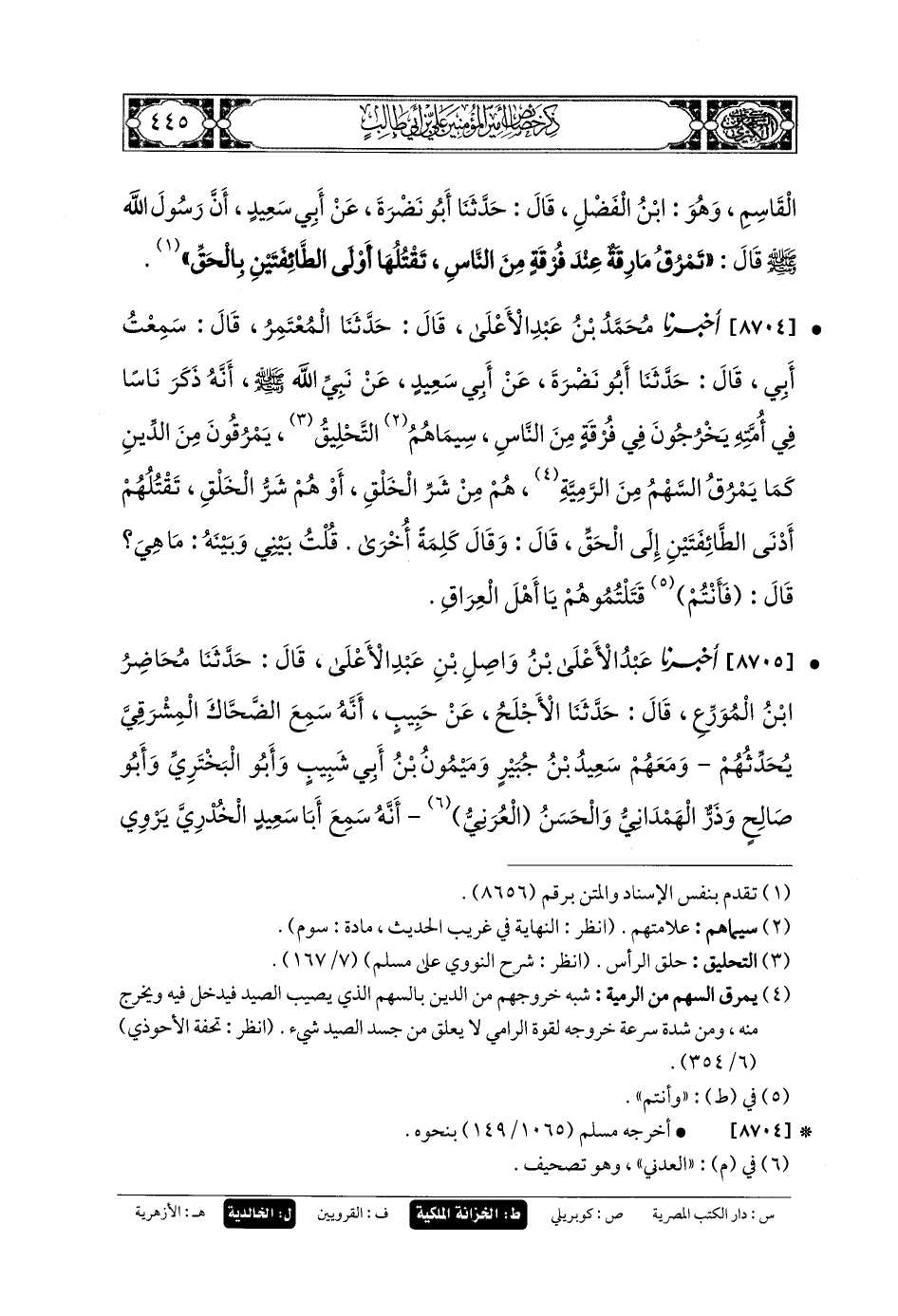8704 - أَخبَرنا مُحَمدُ بنُ عَبدِ الأَعْلَى، قَالَ: حَدثنا المُعْتَمِرُ، قَالَ: سَمِعْتُ أَبي، قَالَ: حَدثنا أَبو نَضْرَةَ، عَن أَبي سَعِيدٍ، عَن نَبِيِّ اللهِ صَلى الله عَلَيهِ وسَلم، أَنَّهُ ذَكَرَ نَاسًا فِي أُمَّتِهِ يَخْرُجُونَ فِي فُرْقَةٍ مِنَ النَّاسِ، سِيمَاهُمُ التَّحْلِيقُ، يَمْرُقُونَ مِنَ الدِّينِ كَمَا يَمْرُقُ السَّهْمُ مِنَ الرَّمِيَّةِ، هُمْ مِنْ شَرِّ الخَلْقِ أَوْ هُمْ شَرُّ الخَلْقِ، تَقْتُلُهُمْ أَدْنَى الطَّائِفَتَيْنِ إِلَى الحَقِّ، قَالَ: وَقَالَ كَلِمَةً أُخْرَى، قُلْتُ بَيْنِي وَبَيْنَهُ: مَا هِيَ؟ قَالَ: فأَنْتُمْ قَتَلْتُمُوهُمْ يَا أَهْلَ العِرَاقِ.