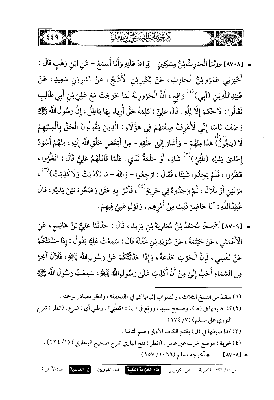 8708 - حدثنا الحَارِثُ بنُ مِسْكِينٍ، قِرَاءَةً عَلَيْهِ، وَأنا أَسْمَعُ، عَنِ ابنِ وَهْبٍ، قَالَ: أَخْبَرَنِي عَمْرُو بنُ الحَارِثِ، عَن بُكَيْرِ بنِ الأَشَجِّ، عَن بُسْرِ بنِ سَعِيدٍ، عَن عُبَيدِ اللهِ بنِ أَبي رَافِعٍ، أَنَّ الحَرُورِيَّةَ لَمَّا خَرَجَتْ مَعَ عَليِّ بنِ أَبي طَالِبٍ فَقَالُوا: لا حُكْمَ إِلاَّ للهِ، قَالَ عَليٌّ: كَلِمَةُ حَقٍّ أُرِيدَ بِهَا بَاطِلٌ، إِنَّ رَسُولَ اللهِ صَلى الله عَلَيهِ وسَلم وَصَفَ نَاسًا، إِنِّي لأَعْرِفُ صِفَتَهُمْ فِي هَؤُلاءِ الَّذِينَ يَقُولُونَ الحَقَّ بِأَلْسِنَتِهِمْ لا يَجُوزُ هَذَا مِنْهُمْ، وَأَشَارَ إِلَى حَلْقِهِ مِنْ أَبْغَضِ خَلْقِ اللهِ إِلَيْهِ، مِنْهُمْ أَسْوَدُ إِحْدَى يَدَيْهِ طُبْيُ شَاةٍ أَوْ حَلَمَةُ ثَدْيٍ، فَلَمَّا قَاتَلَهُمْ عَليٌّ قَالَ: انْظُرُوا فَنَظَرُوا، فَلَمْ يَجِدُوا شَيْئًا، فَقَالَ: ارْجِعُوا وَاللهِ مَا كَذَبْتُ، وَلا كُذِبْتُ، مَرَّتَيْنِ أَوْ ثَلاثًا، ثُمَّ وَجَدُوهُ فِي خَرِبَةٍ، فَأَتَوْا بِهِ حَتَّى وَضَعُوهُ بَيْنَ يَدَيْهِ، قَالَ عُبَيدُ اللهِ: أَنَا حَاضِرٌ ذَلِكَ مِنْ أَمْرِهِمْ، وَقَوْلُ عَليٍّ فِيهِمْ.