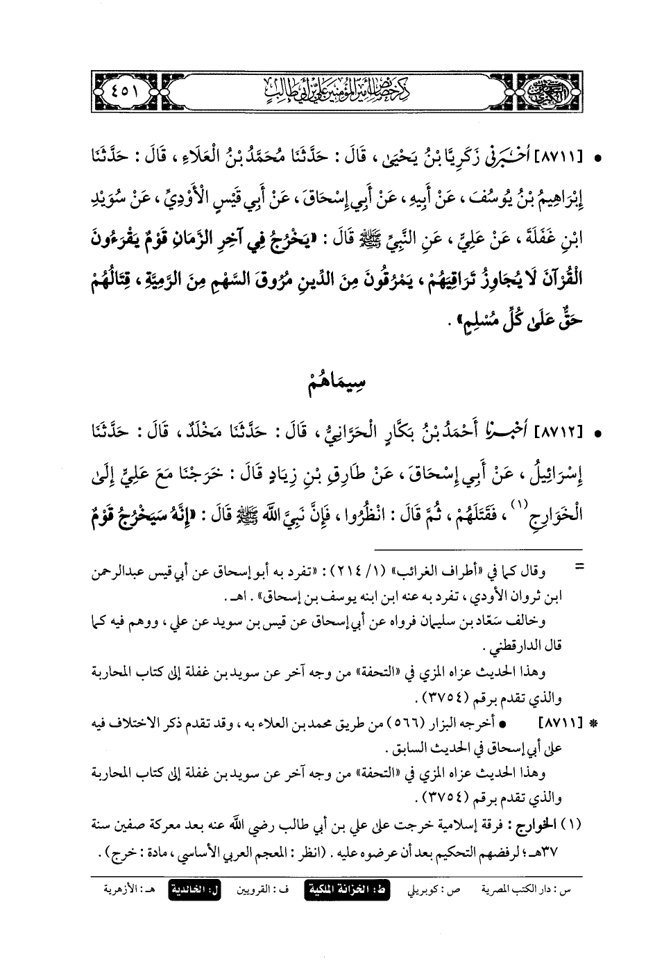 8711 - أَخْبَرَنِي زَكَرِيَّا بنُ يَحيَى، قَالَ: حَدثنا مُحَمدُ بنُ العَلاءِ، قَالَ: حَدثنا إِبْرَاهِيمُ بنُ يُوسُفَ، عَن أَبيهِ، عَن أَبي إِسحَاقَ، عَن أَبي قَيْسٍ الأَوْدِيِّ، عَن سُوَيْدِ بنِ غَفَلَةَ، عَن عَليٍّ، عَنِ النَّبيِّ صَلى الله عَلَيهِ وسَلم قَالَ: يَخْرُجُ فِي آخِرِ الزَّمَانِ قَوْمٌ يَقْرَؤونَ القُرْآنَ، لا يُجَاوِزُ تَرَاقِيَهُمْ، يَمْرُقُونَ مِنَ الدِّينِ مُرُوقَ السَّهْمِ مِنَ الرَّمِيَّةِ، قِتَالُهُمْ حَقٌّ عَلَى كُلِّ مُسْلِمٍ.