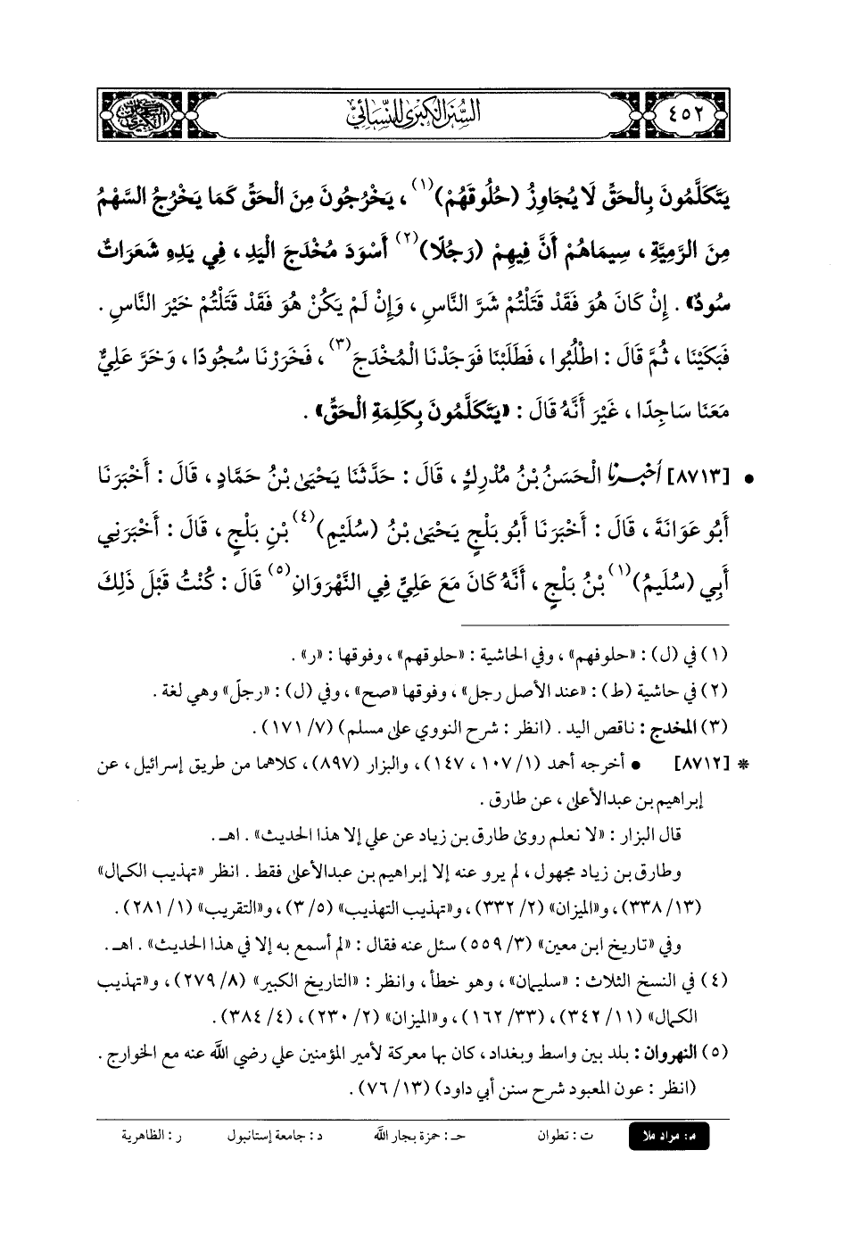 8713 - أَخبَرنا الحَسَنُ بنُ مُدْرِكٍ، قَالَ: حَدثنا يَحيَى بنُ حَمَّادٍ، قَالَ: أَخبَرنا أَبو عَوَانَةَ، قَالَ: أَخبَرنا أَبو بَلْجٍ يَحيَى بنُ سُلَيْمِ بنِ بَلْجٍ، قَالَ: أَخْبَرَنِي أَبي سُلَيْمُ بنُ بَلْجٍ، أَنَّهُ كَانَ مَعَ عَليٍّ فِي النَّهْرَوَانِ قَالَ: كُنْتُ قَبْلَ ذَلِكَ أُصَارِعُ رَجُلاً عَلَى يَدِهِ شَيْءٌ، فَقُلْتُ: مَا شَأْنُ يَدِكَ؟ قَالَ: أَكَلَهَا بَعِيرٌ، فَلَمَّا كَانَ يَوْمُ النَّهْرَوَانِ، وَقَتَلَ عَليٌّ الحَرُورِيَّةَ، فَجَزِعَ عَليٌّ مِنْ قَتْلِهِمْ حِينَ لَمْ يَجِدْ ذَا الثُّدَيِّ، فَطَافَ حَتَّى وَجَدَهُ فِي سَاقِيَةٍ، فَقَالَ: صَدَقَ اللهُ، وَبَلَّغَ رَسُولُهُ، وَقَالَ: وَفِي مَنْكِبَيْهِ ثَلاثُ شَعَرَاتٍ فِي مِثْلِ حَلَمَةِ الثَّدْيِ.