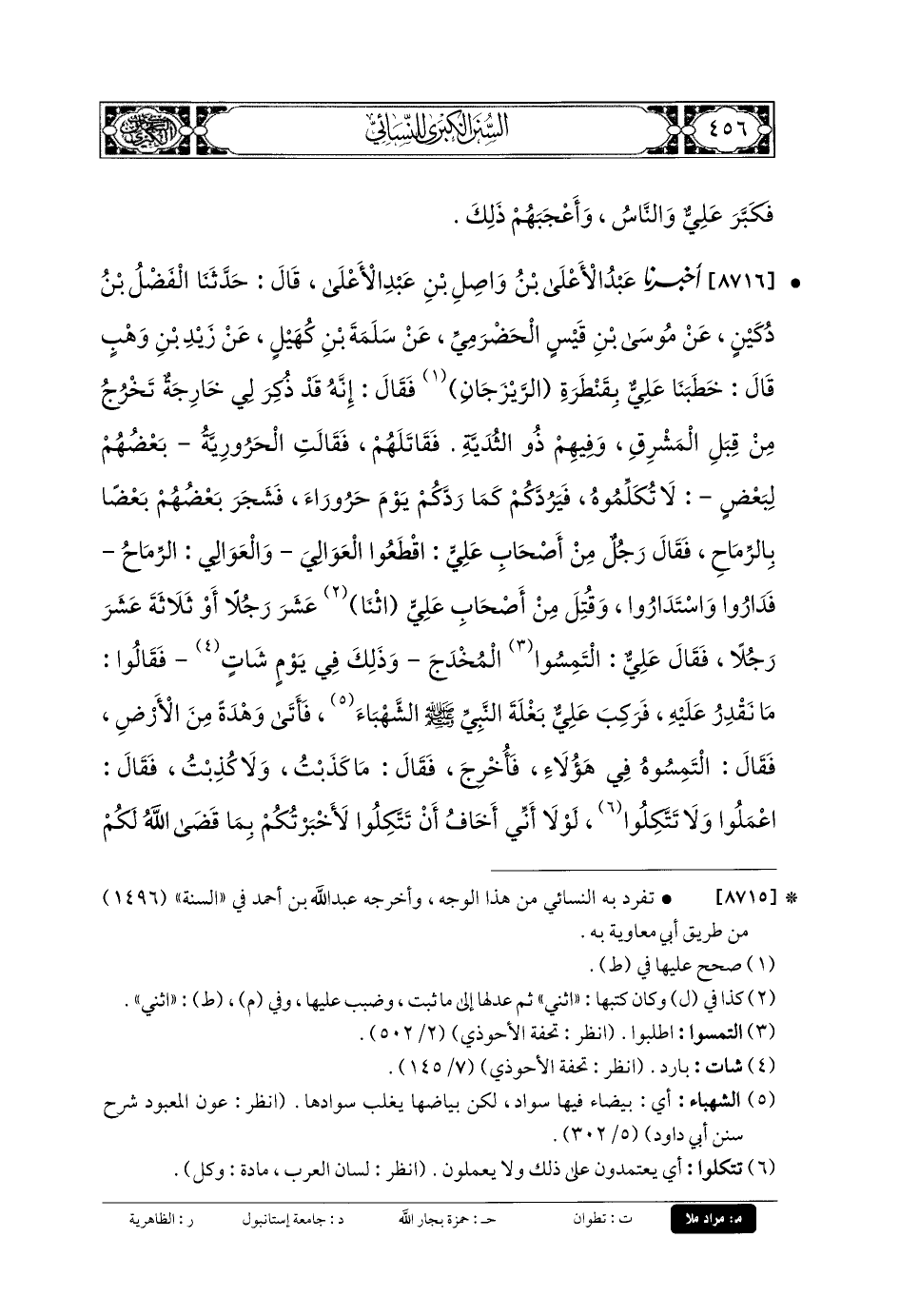 8716 - أَخبَرنا عَبدُ الأَعْلَى بنُ وَاصِلِ بنِ عَبدِ الأَعْلَى، قَالَ: حَدثنا الفَضْلُ بنُ دُكَيْنٍ، عَن مُوسَى بنِ قَيْسٍ الحَضْرَمِيِّ، عَن سَلَمَةَ بنِ كُهَيْلٍ، عَن زَيْدِ بنِ وَهْبٍ قَالَ: خَطَبَنَا عَليٌّ بِقَنْطَرَةٍ الريْزَجَانِ، فَقَالَ: إِنَّهُ قَدْ ذُكِرَ لِي خَارِجَةٌ تَخْرُجُ مِنْ قِبَلِ المَشْرِقِ، وَفِيهِمْ ذُو الثُّدَيَّةِ، فَقَاتِلْهُمْ، فَقَالَتِ الحَرُورِيَّةُ بَعْضُهُمْ لِبَعْضٍ: لا تُكَلِّمُوهُ، فَيَرُدَّكُمْ كَمَا رَدَّكُمْ يَوْمَ حَرُورَاءَ، فَشَجَرَ بَعْضُهُمْ بَعْضًا بِالرِّمَاحِ، فَقَالَ رَجُلٌ مِنْ أَصْحَابِ عَليٍّ: اقْطَعُوا العَوَالِيَ، وَالعَوَالِي الرِّمَاحُ، فَدَارُوا وَاسْتَدَارُوا، وَقُتِلَ مِنْ أَصْحَابِ عَليٍّ اثْنَا عَشَرَ رَجُلاً، أَوْ ثَلاثَةَ عَشَرَ رَجُلاً، فَقَالَ عَليٌّ: التَمِسُوا المُخْدَجَ، وَذَلِكَ فِي يَوْمِ شَاتٍ، فَقَالُوا: مَا نَقْدِرُ عَلَيْهِ، فَرَكِبَ عَليٌّ بَغْلَةَ النَّبيِّ صَلى الله عَلَيهِ وسَلم الشَّهْبَاءَ، فَأَتَى وَهْدَةً مِنَ الأَرْضٍ، فَقَالَ: التَمِسُوهُ فِي هَؤُلاءِ، فَأُخْرِجَ، فَقَالَ: مَا كَذَبْتُ، وَلا كُذِبْتُ، فَقَالَ: اعْمَلُوا وَلا تَتَّكِلُوا، لَوْلا أَنِّي أَخَافُ أَنْ تَتَّكِلُوا لأَخْبَرْتُكُمْ بِمَا قَضَى اللهُ لَكُمْ عَلَى لِسَانِهِ، يَعْنِي النَّبيَّ صَلى الله عَلَيهِ وسَلم، وَلَقَدْ شَهِدَنَا أُنَاسٌ بِاليَمَنِ، قَالُوا: كَيْفَ يَا أَمِيرَ المُؤْمِنِينَ؟ قَالَ: كَانَ هَوَاؤهمْ مَعَنَا.