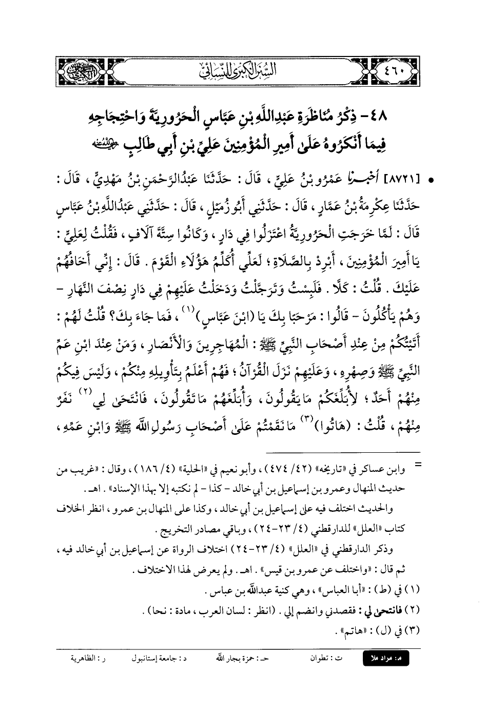 48 - ذِكْرُ مُنَاظَرَةِ عَبدِ اللهِ بنِ عَبَّاسٍ الحَرُورِيَّةَ وَاحْتِجَاجِهِ فِيمَا أَنْكَرُوهُ عَلَى أَمِيرِ المُؤْمِنِينَ عَليِّ بنِ أَبي طَالِبٍ رَضِيَ اللهُ عَنهُ.