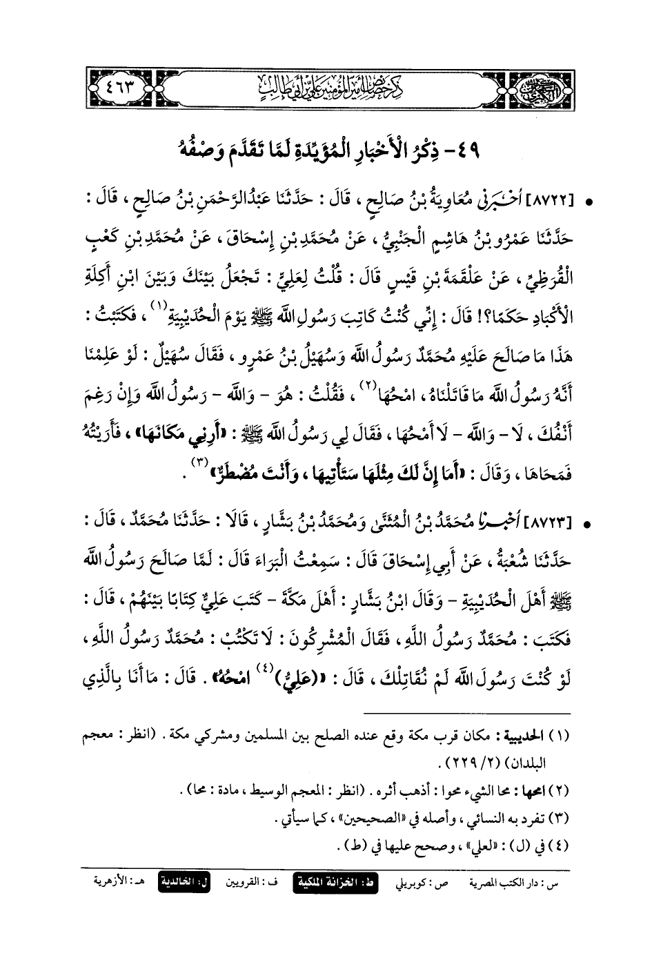 8722 - أَخْبَرَنِي مُعاويَةُ بنُ صَالِحٍ، قَالَ: حَدثنا عَبدُ الرَّحمَنِ بنُ صَالِحٍ، قَالَ: حَدثنا عَمْرُو بنُ هَاشِمٍ الجَنْبِيُّ، عَن مُحَمدِ بنِ إِسحَاقَ، عَن مُحَمدِ بنِ كَعْبٍ القُرَظِيِّ، عَن عَلْقَمَةَ بْنَ قَيْسٍ قَالَ: قُلْتُ لِعَليٍّ: تَجْعَلُ بَيْنَكَ وَبَيْنَ ابنِ أكِلَةِ الأَكْبَادَ حَكَمًا؟ قَالَ: إِنِّي كُنْتُ كَاتِبَ رَسُولِ اللهِ صَلى الله عَلَيهِ وسَلم يَوْمَ الحُدَيْبِيَةِ، فَكَتَبَ هَذَا مَا صَالَحَ عَلَيْهِ مُحَمدٌ رَسُولُ اللهِ، وَسُهَيلُ بنُ عَمْرٍو، فَقَالَ سُهَيلٌ: لَوْ عَلِمْنَا أَنَّهُ رَسُولُ اللهِ مَا قَاتَلْنَاهُ، امْحُهَا، فَقُلْتُ: هُوَ وَاللهِ رَسُولُ اللهِ، وَإِنْ رَغِمَ أَنْفُكَ، لا وَاللهِ لا أَمْحُهَا، فَقَالَ لي رَسُولُ اللهِ صَلى الله عَلَيهِ وسَلم: أَرِنِي مَكَانَهَا، فَأَرَيْتُهُ فَمَحَاهَا، وَقَالَ: أَمَا إِنَّ لَكَ مِثْلَهَا، سَتَأْتِيهَا وَأَنْتَ مُضْطَرٌّ.